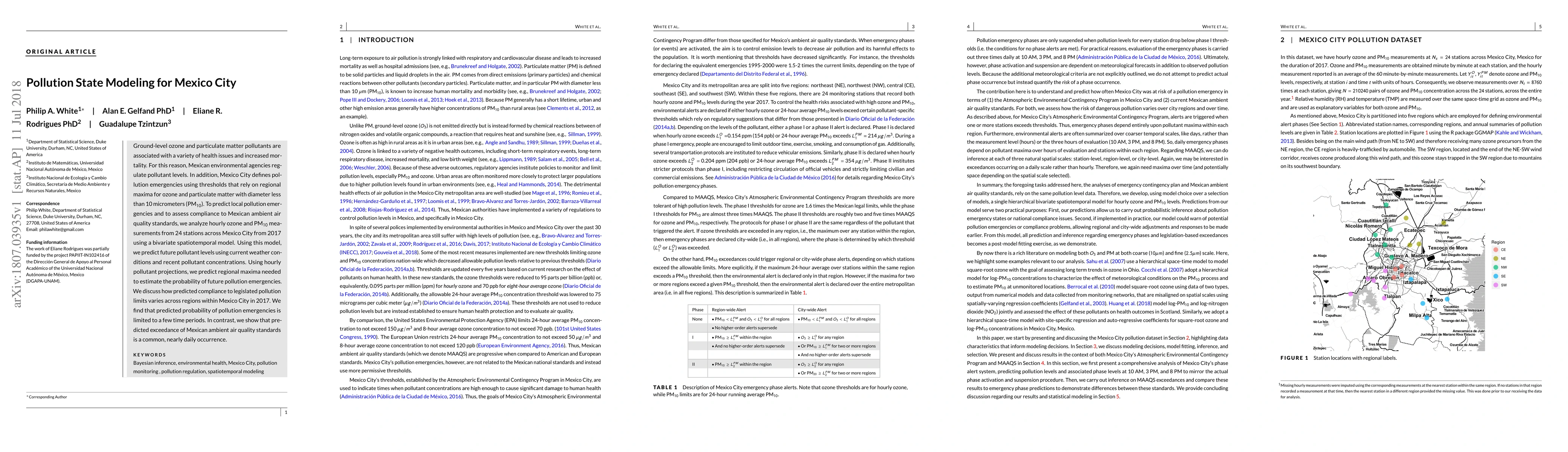 This paper develops a bivariate spatiotemporal model to predict local pollution emergencies in Mexico City by analyzing hourly ozone and PM₁₀ measurements from 24 stations. The model forecasts future pollution levels and assesses compliance with Mexican air quality standards, revealing frequent exceedance of these standards despite limited predicted pollution emergencies.