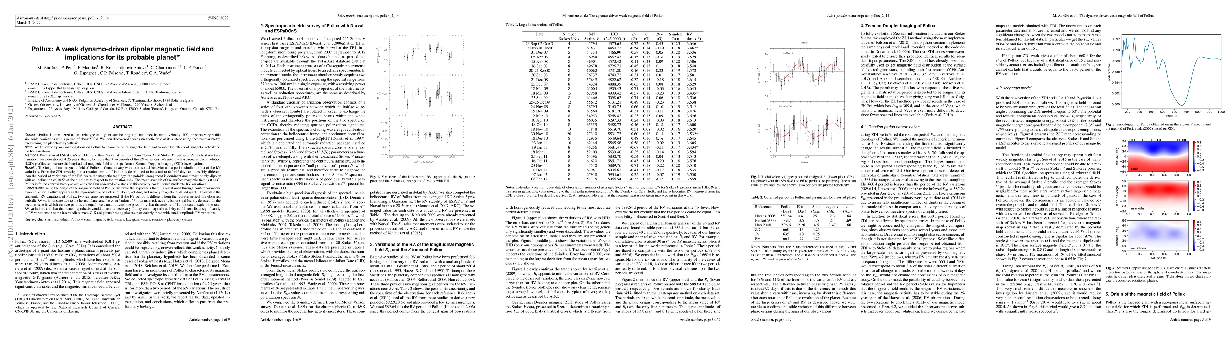Context: Pollux is considered as an archetype of a giant star hosting a planet. We then discovered a weak magnetic field at its surface using spectropolarimetry. Aims and Methods: We followed up our investigations on Pollux first using ESPaDOnS at CFHT and then Narval at TBL to obtain Stokes I and Stokes V spectra to study their variations for a duration of 4.25 years, that is, for more than two periods of about 590 d of the RV variations. We used the least-squares deconvolution (LSD) profiles to measure the longitudinal magnetic field and to perform a Zeeman Doppler imaging (ZDI) investigation. Results: The longitudinal magnetic field of Pollux is found to vary with a sinusoidal behavior and a period similar to that of the RV variations. From the ZDI investigation a rotation period of Pollux is determined to be equal to 660+/-15 days and possibly different than the period of variations of the RV. As to the magnetic topology, the poloidal component is dominant and almost purely dipolar with an inclination of 10.5{\deg} of the dipole with respect to the rotation axis. The mean strength of the surface magnetic field is 0.44 G. Conclusions: As to the origin of the magnetic field of Pollux, we favor the hypothesis that it is maintained through contemporaneous dynamo action. Pollux appears as the representative of a class of slowly rotating and weakly magnetic G-K red giants. To explain the sinusoidal RV variations of Pollux, two scenarios are proposed. If the RV period is different from the rotation period, the observed periodic RV variations are due to the hosted planet and the contribution of Pollux magnetic activity is not significantly detected. In the peculiar case in which the two periods are equal, we cannot discard the possibility that the activity of Pollux could explain the total RV variations and that the planet hypothesis would appear unnecessary.