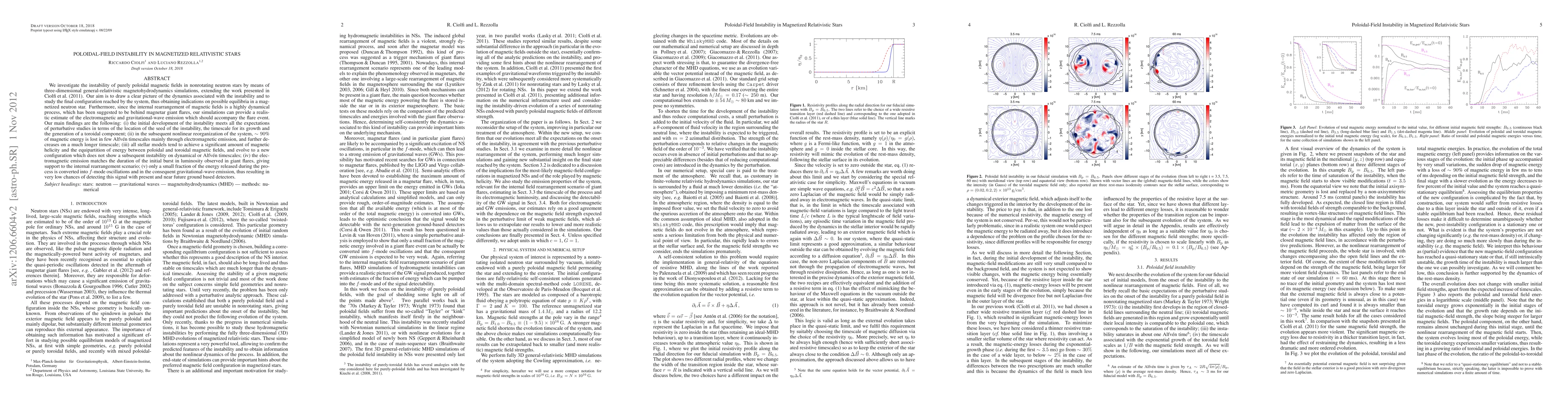 We investigate the instability of purely poloidal magnetic fields in nonrotating neutron stars by means of three-dimensional general-relativistic magnetohydrodynamics simulations, extending the work presented in Ciolfi et al. (2011). Our aim is to draw a clear picture of the dynamics associated with the instability and to study the final configuration reached by the system, thus obtaining indications on possible equilibria in a magnetized neutron star. Furthermore, since the internal rearrangement of magnetic fields is a highly dynamical process, which has been suggested to be behind magnetar giant flares, our simulations can provide a realistic estimate of the electromagnetic and gravitational-wave emission which should accompany the flare event. Our main findings are the following: (i) the initial development of the instability meets all the expectations of perturbative studies in terms of the location of the seed of the instability, the timescale for its growth and the generation of a toroidal component; (ii) in the subsequent nonlinear reorganization of the system, ~90% of magnetic energy is lost in few Alfven timescales mainly through electromagnetic emission, and further decreases on a much longer timescale; (iii) all stellar models tend to achieve a significant amount of magnetic helicity and the equipartition of energy between poloidal and toroidal magnetic fields, and evolve to a new configuration which does not show a subsequent instability on dynamical or Alfven timescales; (iv) the electromagnetic emission matches the duration of the initial burst in luminosity observed in giant flares, giving support to the internal rearrangement scenario; (v) only a small fraction of the energy released during the process is converted into f-mode oscillations and in the consequent gravitational-wave emission, thus resulting in very low chances of detecting this signal with present and..
