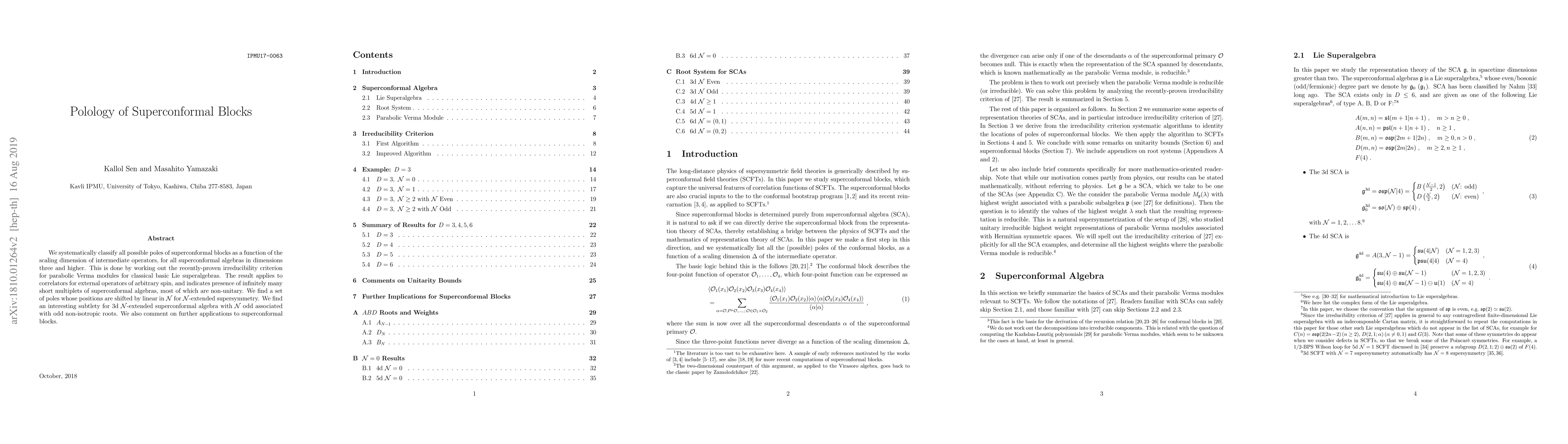 We systematically classify all possible poles of superconformal blocks as a function of the scaling dimension of intermediate operators, for all superconformal algebras in dimensions three and higher. This is done by working out the recently-proven irreducibility criterion for parabolic Verma modules for classical basic Lie superalgebras. The result applies to correlators for external operators of arbitrary spin, and indicates presence of infinitely many short multiplets of superconformal algebras, most of which are non-unitary. We find a set of poles whose positions are shifted by linear in $\mathcal{N}$ for $\mathcal{N}$-extended supersymmetry. We find an interesting subtlety for 3d $\mathcal{N}$-extended superconformal algebra with $\mathcal{N}$ odd associated with odd non-isotropic roots. We also comment on further applications to superconformal blocks.