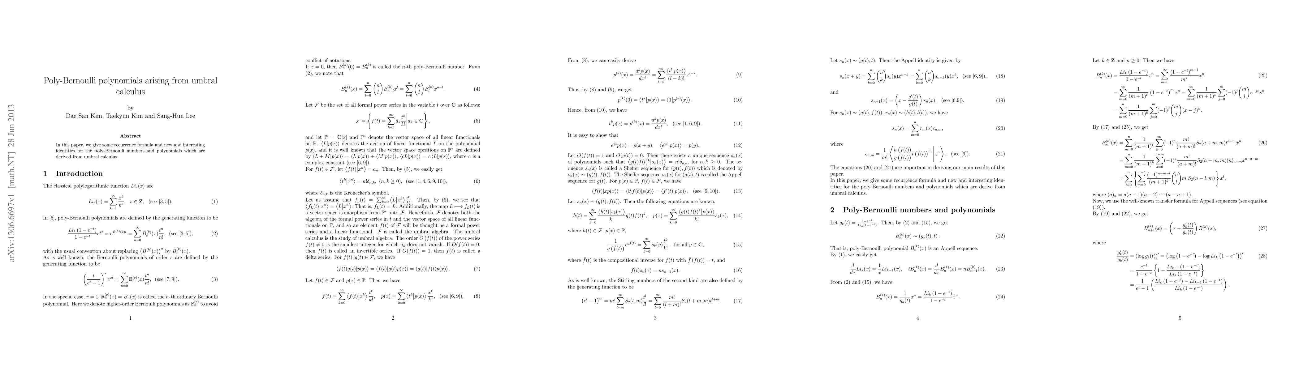 Summary: This paper presents recurrence relations and novel identities for poly-Bernoulli numbers and polynomials, derived through the framework of umbral calculus. The findings contribute to the understanding of these mathematical constructs.