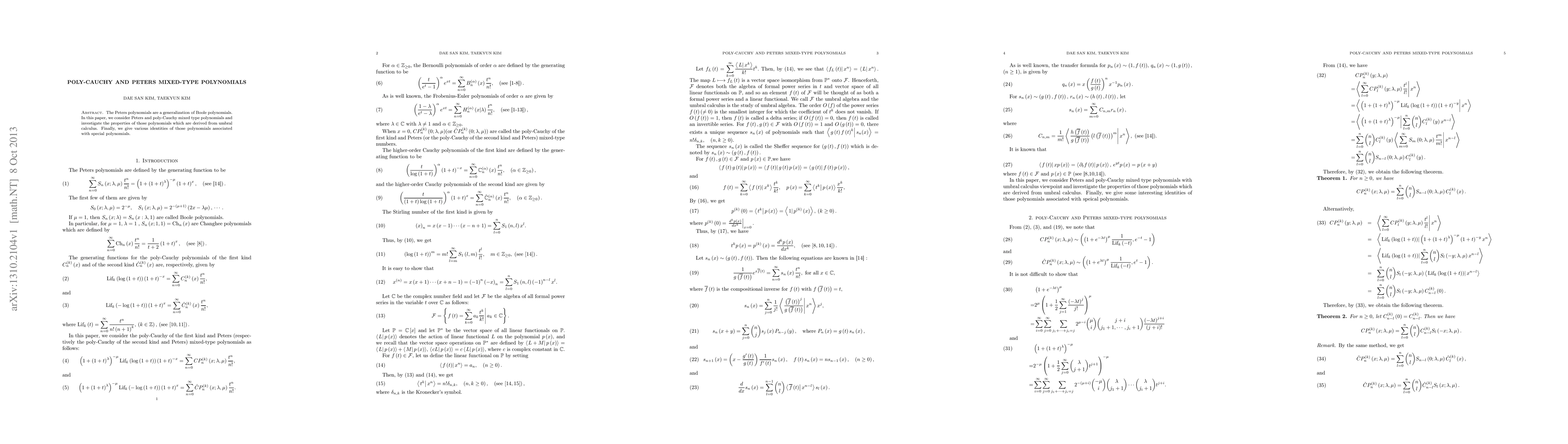 Summary: This paper explores Peters and poly-Cauchy mixed-type polynomials, derived from umbral calculus, and investigates their properties, concluding with various identities linking them to special polynomials.