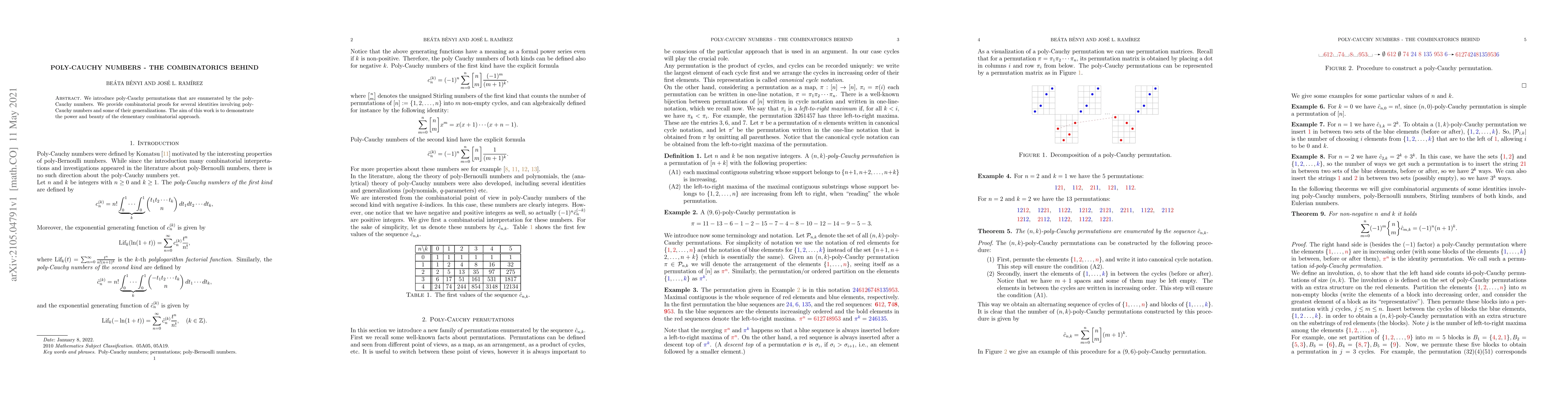 Summary: This paper introduces poly-Cauchy permutations and enumerates them using poly-Cauchy numbers, providing combinatorial proofs for various identities. It showcases the elegance of elementary combinatorial methods.