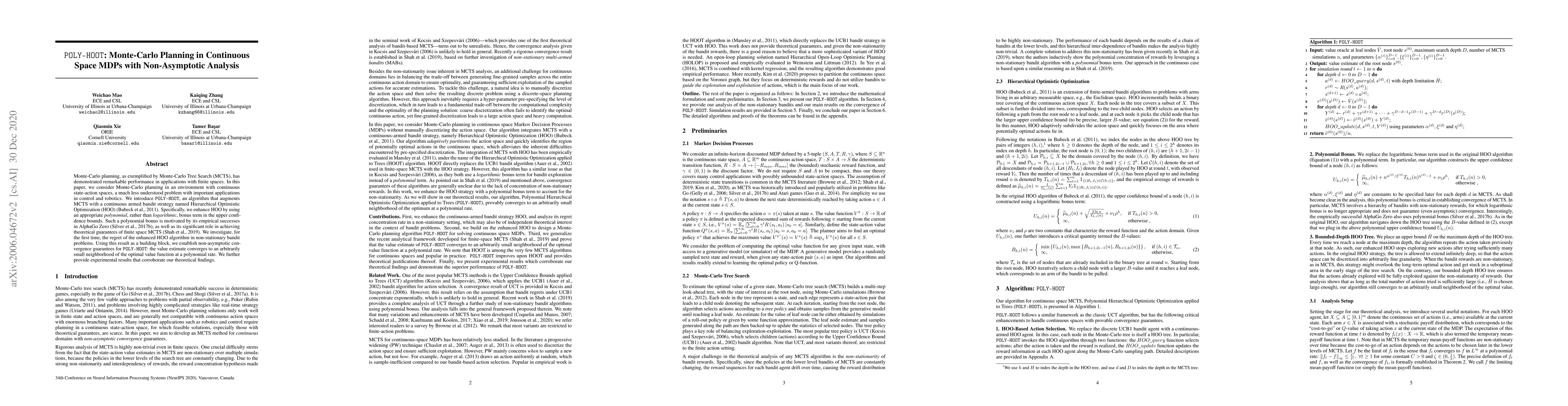 This paper introduces POLY-HOOT, an advanced Monte-Carlo planning algorithm for continuous state-action spaces, combining Monte-Carlo Tree Search with a continuous bandit strategy. It establishes non-asymptotic convergence guarantees and demonstrates empirical success in control and robotics applications.