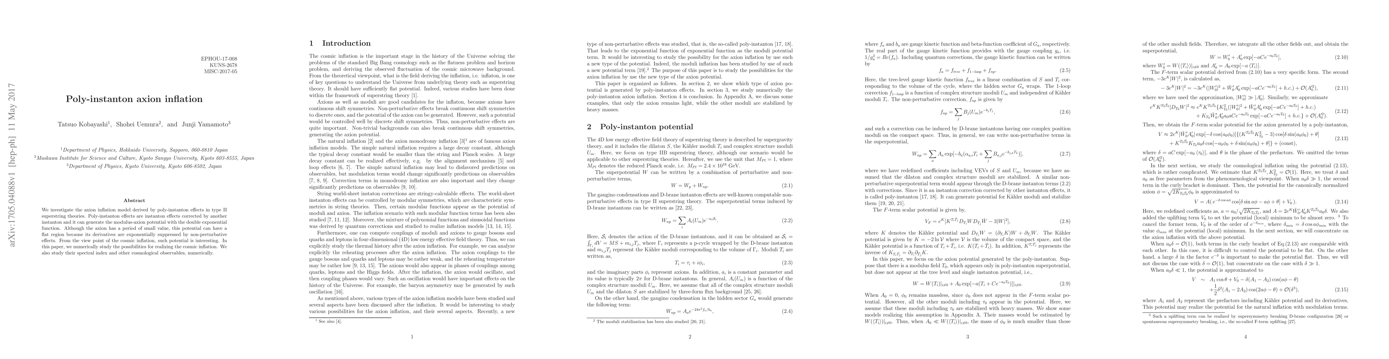 This paper investigates an axion inflation model generated by poly-instanton effects in type II superstring theories, exploring the potential for realizing cosmic inflation and analyzing the spectral index and other cosmological observables numerically. The model features a double exponential modulus-axion potential with a flat region due to suppressed derivatives from non-perturbative effects.