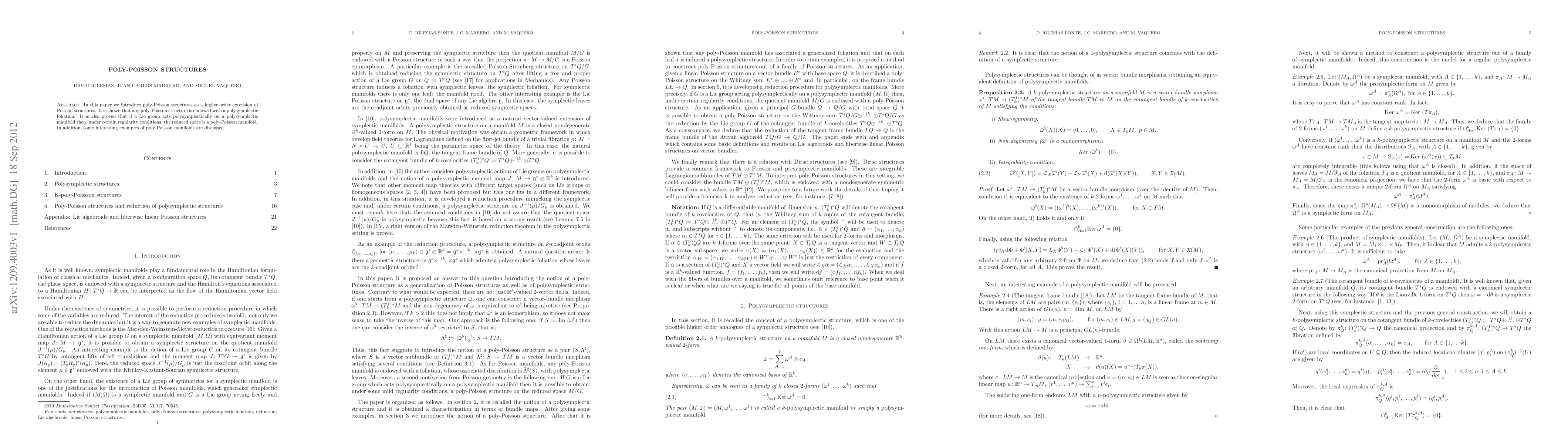 In this paper we introduce poly-Poisson structures as a higher-order extension of Poisson structures. It is shown that any poly-Poisson structure is endowed with a polysymplectic foliation. It is also proved that if a Lie group acts polysymplectically on a polysymplectic manifold then, under certain regularity conditions, the reduced space is a poly-Poisson manifold. In addition, some interesting examples of poly-Poisson manifolds are discussed.