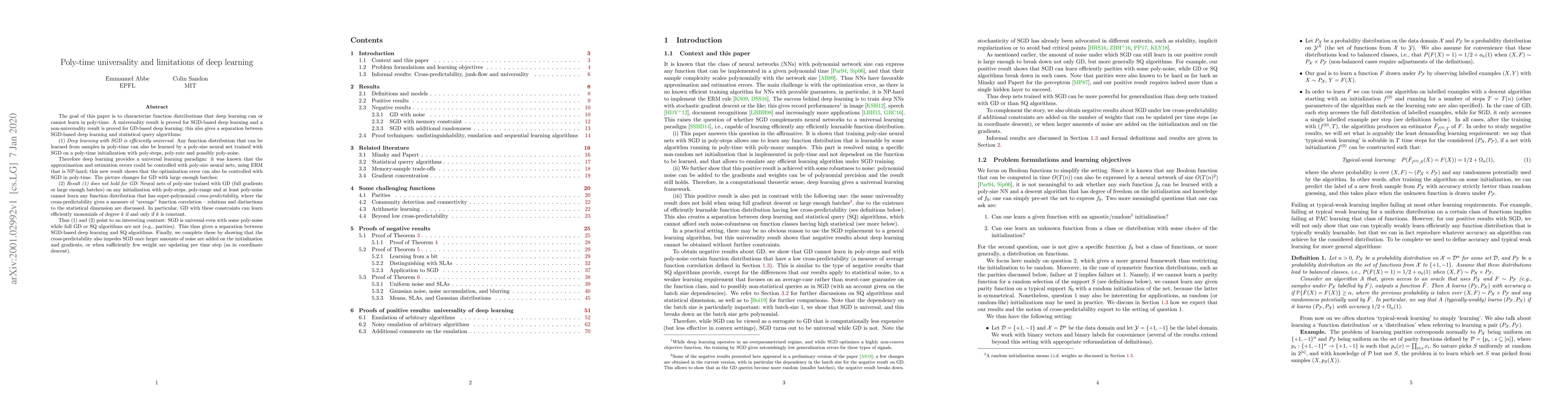 The goal of this paper is to characterize function distributions that deep learning can or cannot learn in poly-time. A universality result is proved for SGD-based deep learning and a non-universality result is proved for GD-based deep learning; this also gives a separation between SGD-based deep learning and statistical query algorithms: (1) {\it Deep learning with SGD is efficiently universal.} Any function distribution that can be learned from samples in poly-time can also be learned by a poly-size neural net trained with SGD on a poly-time initialization with poly-steps, poly-rate and possibly poly-noise. Therefore deep learning provides a universal learning paradigm: it was known that the approximation and estimation errors could be controlled with poly-size neural nets, using ERM that is NP-hard; this new result shows that the optimization error can also be controlled with SGD in poly-time. The picture changes for GD with large enough batches: (2) {\it Result (1) does not hold for GD:} Neural nets of poly-size trained with GD (full gradients or large enough batches) on any initialization with poly-steps, poly-range and at least poly-noise cannot learn any function distribution that has super-polynomial {\it cross-predictability,} where the cross-predictability gives a measure of ``average'' function correlation -- relations and distinctions to the statistical dimension are discussed. In particular, GD with these constraints can learn efficiently monomials of degree $k$ if and only if $k$ is constant. Thus (1) and (2) point to an interesting contrast: SGD is universal even with some poly-noise while full GD or SQ algorithms are not (e.g., parities).