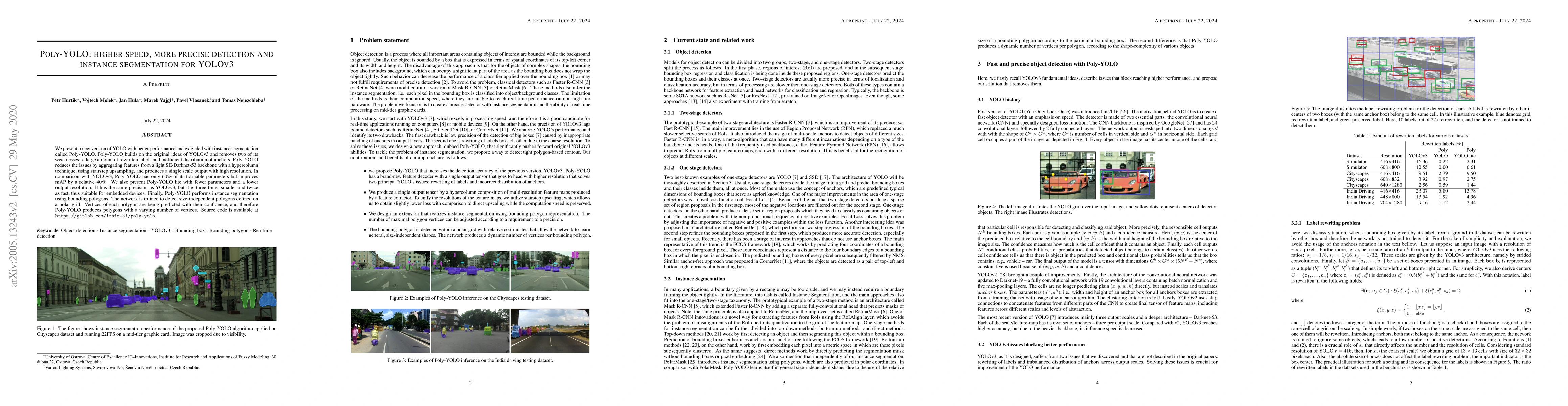 Poly-YOLO enhances YOLOv3 by optimizing label management and anchor distribution, achieving higher speed and precision through a lightweight backbone and improved upsampling. It also introduces instance segmentation with size-independent polygons, offering better performance with fewer parameters.