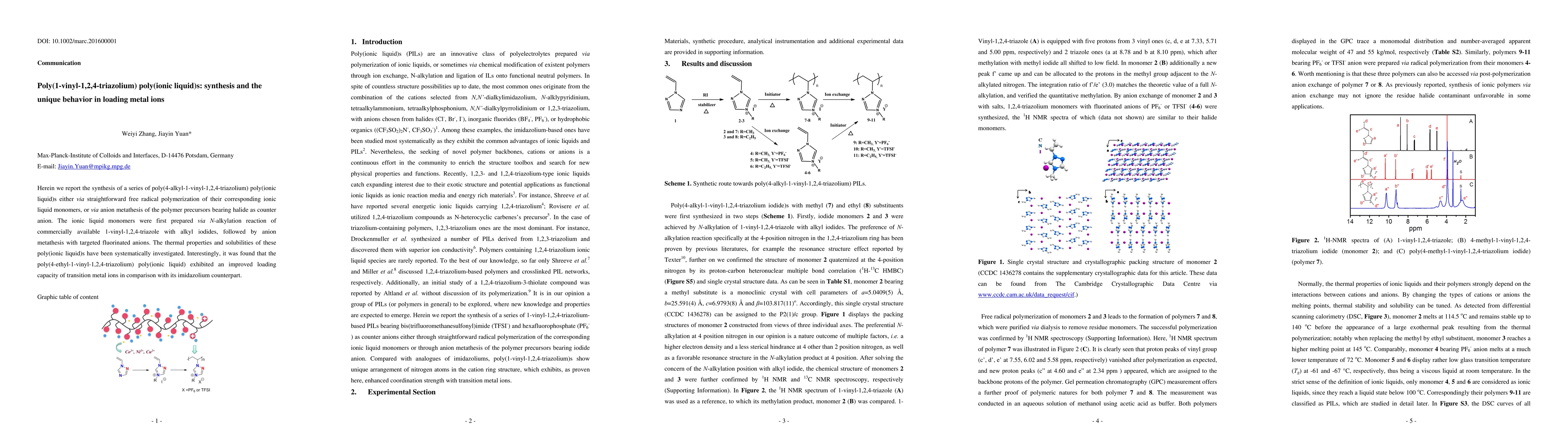 This paper details the synthesis of poly(1-vinyl-1,2,4-triazolium) poly(ionic liquid)s through free radical polymerization and anion metathesis. The study reveals that poly(4-ethyl-1-vinyl-1,2,4-triazolium) poly(ionic liquid) shows superior metal ion loading capacity compared to poly(ionic liquid)s based on imidazolium.