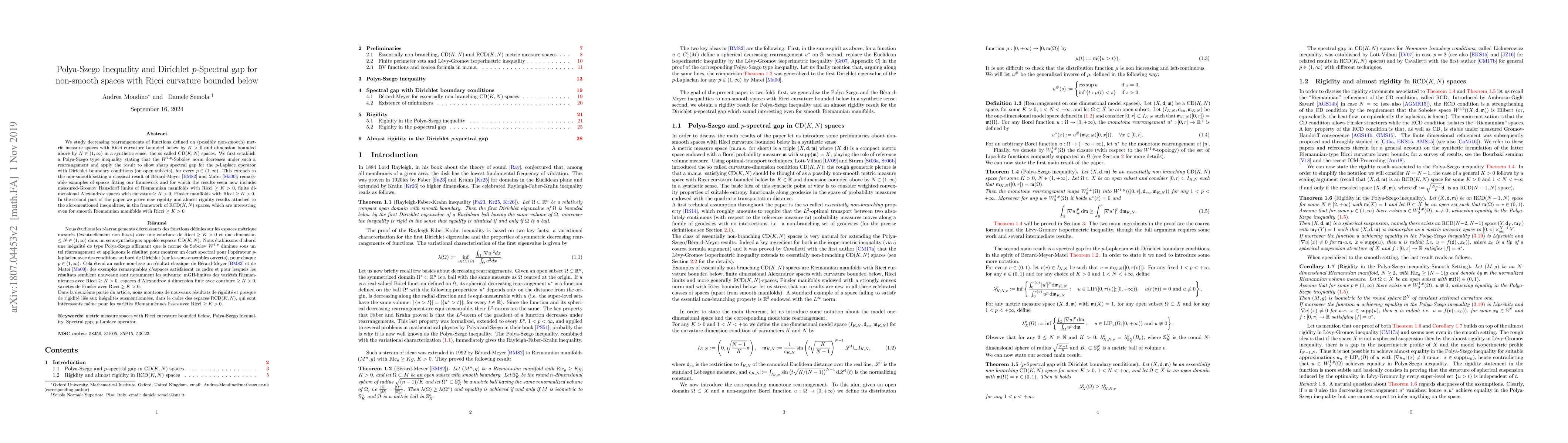 This paper establishes a Polya-Szego inequality for $W^{1,p}$-Sobolev norms in $CD(K,N)$ spaces, extending classical results to non-smooth settings. It also proves sharp spectral gaps for the $p$-Laplace operator in these spaces, with new examples including measured-Gromov Hausdorff limits of Ricci-bounded Riemannian manifolds.