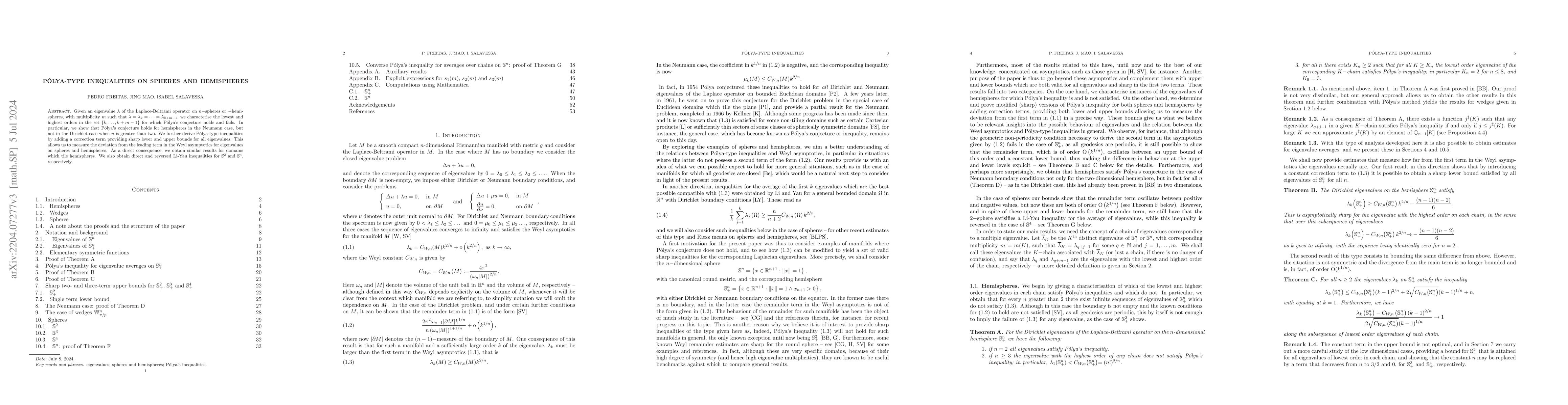 The paper characterizes the validity of Pólya's conjecture for eigenvalues of the Laplace-Beltrami operator on $n$-spheres and hemispheres, proving it holds for hemispheres in the Neumann case but not in the Dirichlet case for $n>2$. It also derives Pólya-type inequalities with correction terms, establishing sharp bounds and measuring eigenvalue deviations in Weyl asymptotics.