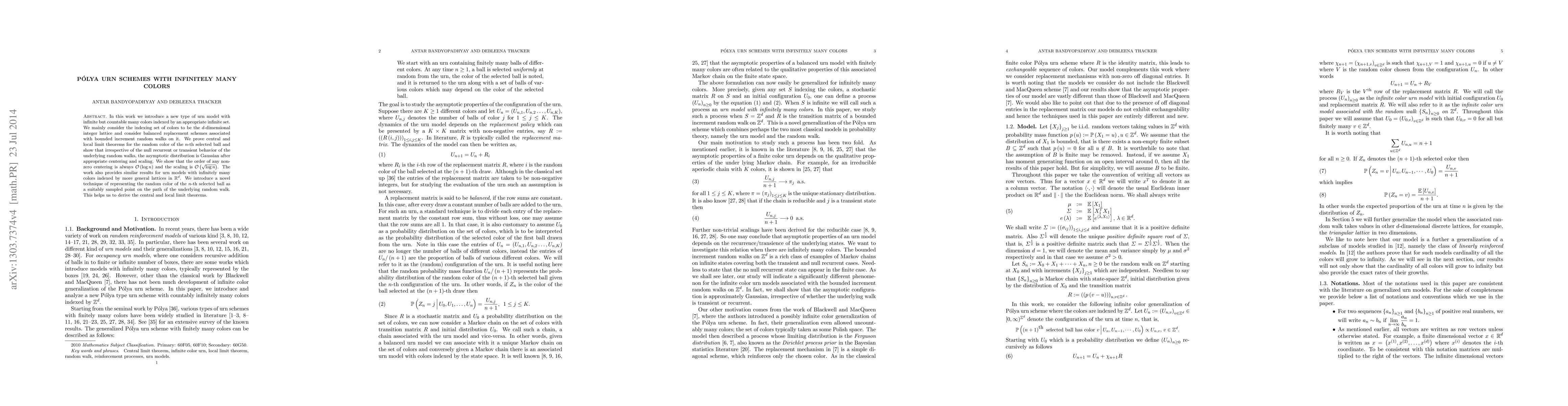 In this work we introduce a new type of urn model with infinite but countable many colors indexed by an appropriate infinite set. We mainly consider the indexing set of colors to be the $d$-dimensional integer lattice and consider balanced replacement schemes associated with bounded increment random walks on it. We prove central and local limit theorems for the random color of the $n$-th selected ball and show that irrespective of the null recurrent or transient behavior of the underlying random walks, the asymptotic distribution is Gaussian after appropriate centering and scaling. We show that the order of any non-zero centering is always ${\mathcal O}\left(\log n\right)$ and the scaling is ${\mathcal O}\left(\sqrt{\log n}\right)$. The work also provides similar results for urn models with infinitely many colors indexed by more general lattices in ${\mathbb R}^d$. We introduce a novel technique of representing the random color of the $n$-th selected ball as a suitably sampled point on the path of the underlying random walk. This helps us to derive the central and local limit theorems.