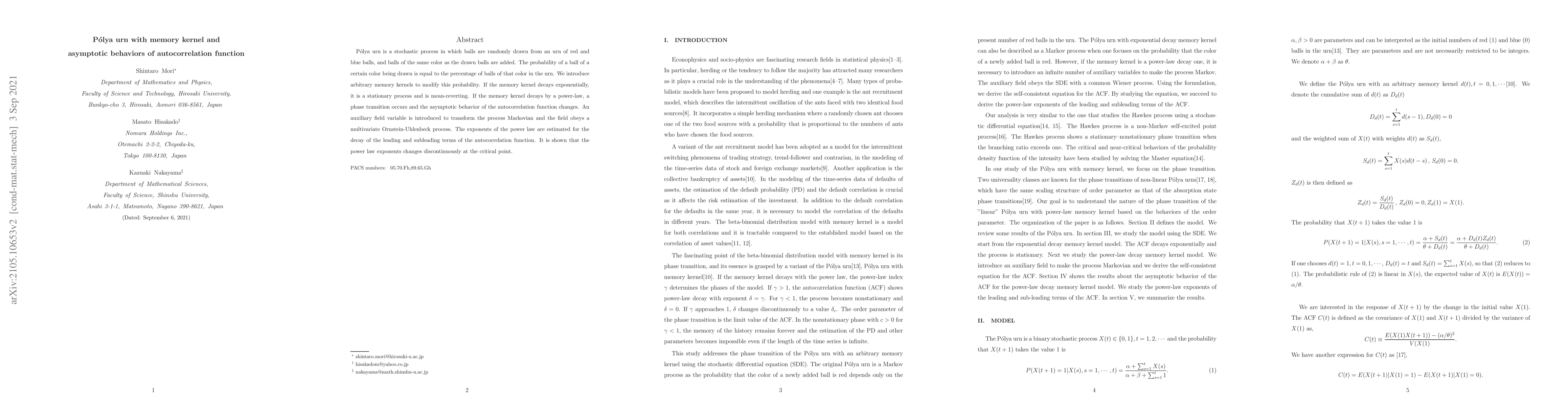 P\'{o}lya urn is a stochastic process in which balls are randomly drawn from an urn of red and blue balls, and balls of the same color as the drawn balls are added. The probability of a ball of a certain color being drawn is equal to the percentage of balls of that color in the urn. We introduce arbitrary memory kernels to modify this probability. If the memory kernel decays exponentially, it is a stationary process and is mean-reverting. If the memory kernel decays by a power-law, a phase transition occurs and the asymptotic behavior of the autocorrelation function changes. An auxiliary field variable is introduced to transform the process Markovian and the field obeys a multivariate Ornstein-Uhlenbeck process. The exponents of the power law are estimated for the decay of the leading and subleading terms of the autocorrelation function. It is shown that the power law exponents changes discontinuously at the critical point.