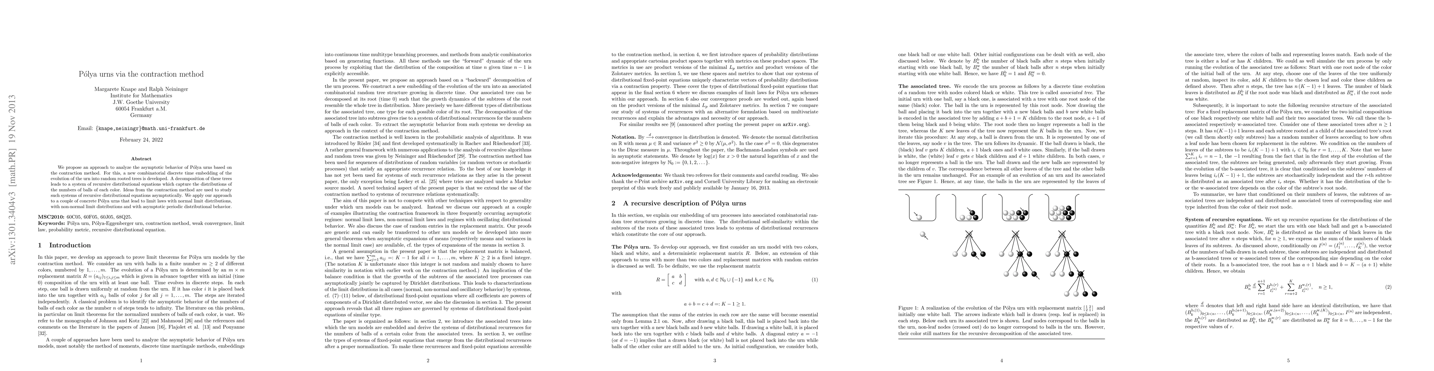 This paper introduces a new combinatorial method for analyzing the asymptotic behavior of Polya urns using the contraction method, which involves embedding the urn's evolution into random rooted trees and solving recursive distributional equations to derive limit laws, including normal, non-normal, and periodic distributions.