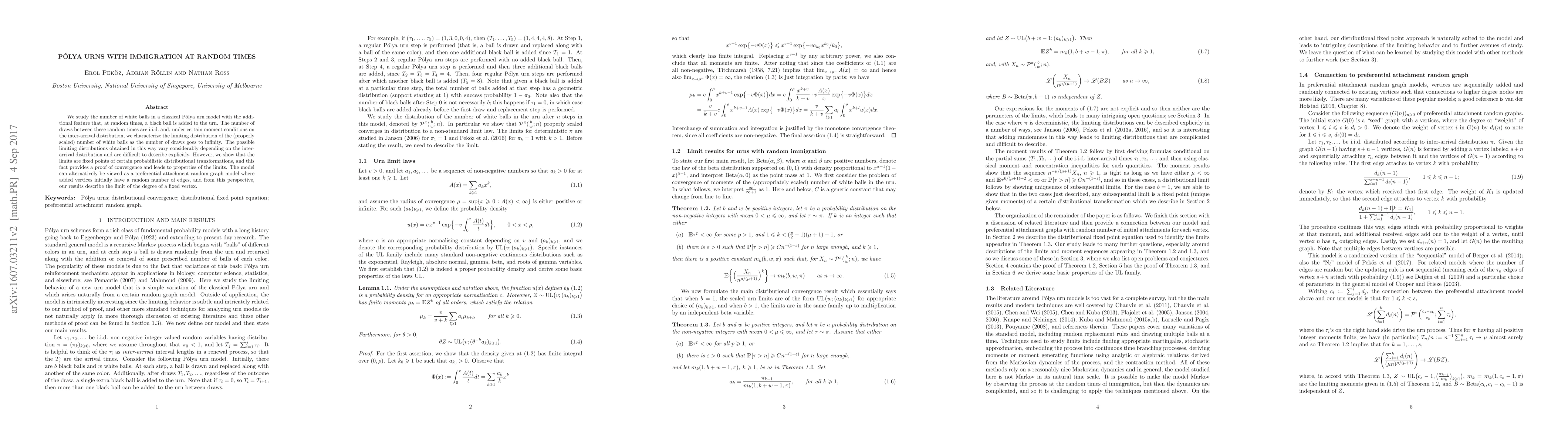 We study the number of white balls in a classical P\'olya urn model with the additional feature that, at random times, a black ball is added to the urn. The number of draws between these random times are i.i.d. and, under certain moment conditions on the inter-arrival distribution, we characterize the limiting distribution of the (properly scaled) number of white balls as the number of draws goes to infinity. The possible limiting distributions obtained in this way vary considerably depending on the inter-arrival distribution and are difficult to describe explicitly. However, we show that the limits are fixed points of certain probabilistic distributional transformations, and this fact provides a proof of convergence and leads to properties of the limits. The model can alternatively be viewed as a preferential attachment random graph model where added vertices initially have a random number of edges, and from this perspective, our results describe the limit of the degree of a fixed vertex.