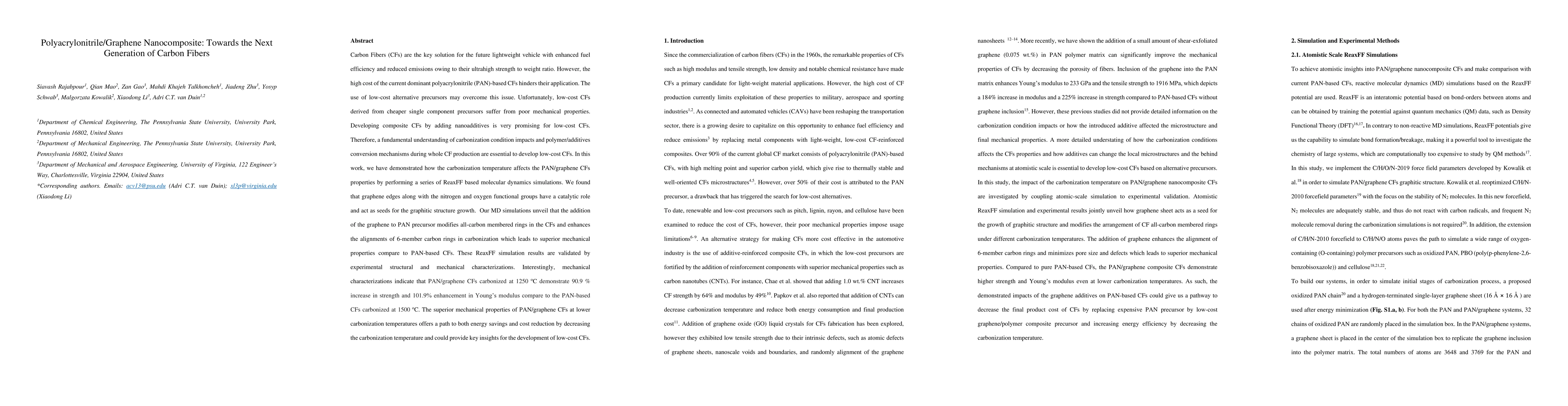 Carbon Fibers (CFs) are the key solution for the future lightweight vehicle with enhanced fuel efficiency and reduced emissions owing to their ultrahigh strength to weight ratio. However, the high cost of the current dominant PAN-based CFs hinders their application. The use of low-cost alternative precursors may overcome this issue. Unfortunately, low-cost CFs derived from cheaper single component precursors suffer from poor mechanical properties. Developing composite CFs by adding nanoadditives is very promising for low-cost CFs. Therefore, a fundamental understanding of carbonization condition impacts and polymer/additives conversion mechanisms during whole CF production are essential to develop low-cost CFs. In this work, we have demonstrated how the carbonization temperature affects the PAN/graphene CFs properties by performing a series of ReaxFF based molecular dynamics simulations. We found that graphene edges along with the nitrogen and oxygen functional groups have a catalytic role and act as seeds for the graphitic structure growth. Our MD simulations unveil that the addition of the graphene to PAN precursor modifies all-carbon membered rings in CFs and enhances the alignments of 6-member carbon rings in carbonization which leads to superior mechanical properties compare to PAN-based CFs. These ReaxFF simulation results are validates by experimental structural and mechanical characterizations. Interestingly, mechanical characterizations indicate that PAN/graphene CFs carbonized at 1250 C demonstrate 90.9% increase in strength and 101.9% enhancement in Young's modulus compare to the PAN-based CFs carbonized at 1500 C. The superior mechanical properties of PAN/graphene CFs at lower carbonization temperatures offers a path to both energy savings and cost reduction by decreasing the carbonization temperature and could provide key insights for the development of low-cost CFs.