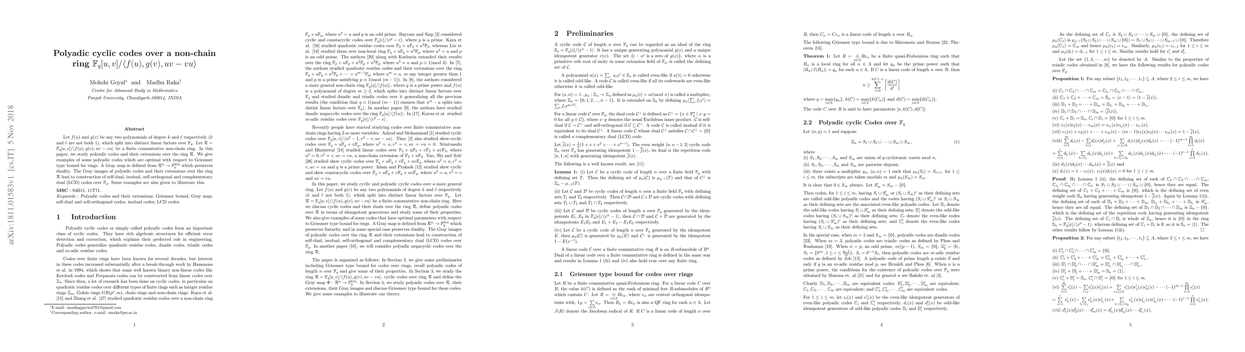 Let $f(u)$ and $g(v)$ be any two polynomials of degree $k$ and $\ell$ respectively ($k$ and $\ell$ are not both $1$), which split into distinct linear factors over $\mathbb{F}_{q}$. Let $\mathcal{R}=\mathbb{F}_{q}[u,v]/\langle f(u),g(v),uv-vu\rangle$ be a finite commutative non-chain ring. In this paper, we study polyadic codes and their extensions over the ring $\mathcal{R}$. We give examples of some polyadic codes which are optimal with respect to Griesmer type bound for rings. A Gray map is defined from $\mathcal{R}^n \rightarrow \mathbb{F}^{k\ell n}_q$ which preserves duality. The Gray images of polyadic codes and their extensions over the ring $\mathcal{R}$ lead to construction of self-dual, isodual, self-orthogonal and complementary dual (LCD) codes over $\mathbb{F}_q$. Some examples are also given to illustrate this.