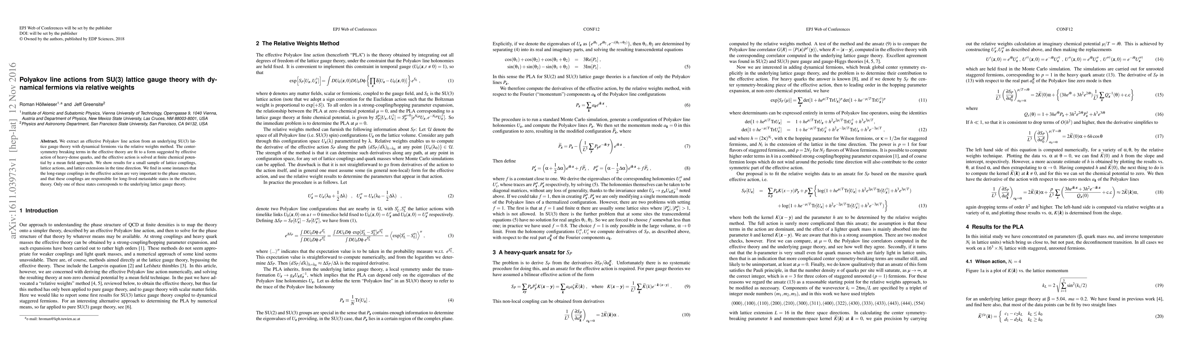 We extract an effective Polyakov line action from an underlying SU(3) lattice gauge theory with dynamical fermions via the relative weights method. The center-symmetry breaking terms in the effective theory are fit to a form suggested by effective action of heavy-dense quarks, and the effective action is solved at finite chemical potential by a mean field approach. We show results for a small sample of lattice couplings, lattice actions, and lattice extensions in the time direction. We find in some instances that the long-range couplings in the effective action are very important to the phase structure, and that these couplings are responsible for long-lived metastable states in the effective theory. Only one of these states corresponds to the underlying lattice gauge theory.