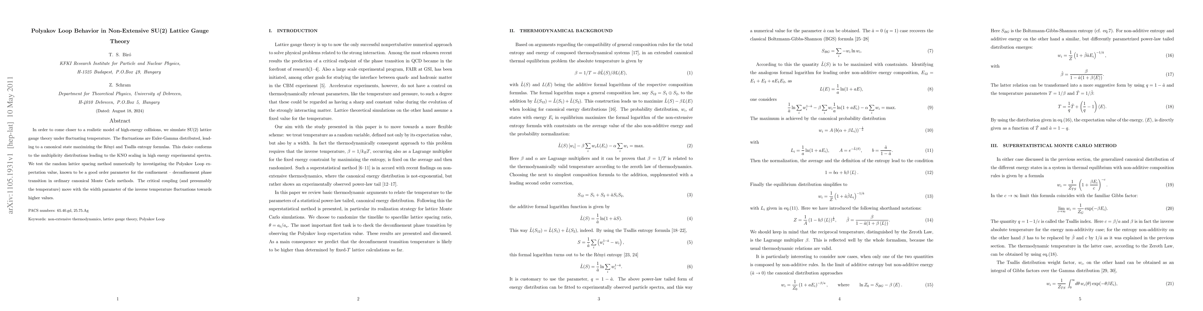 In order to come closer to a realistic model of high-energy collisions, we simulate SU(2) lattice gauge theory under fluctuating temperature. The fluctuations are Euler-Gamma distributed, leading to a canonical state maximizing the Renyi and Tsallis entropy formulas. We test the random lattice spacing method numerically on the Polyakov Loop expectation value. The critical coupling and presumably also the critical deconfinement temperature shifts about 30 per cent to higher values with a realistic degree of fluctuations.