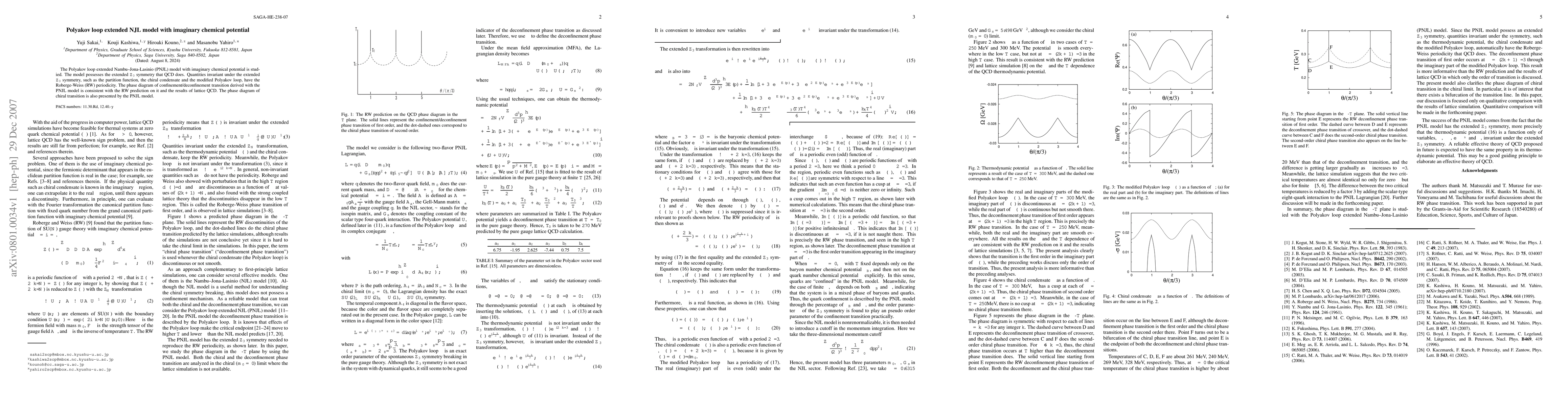 The Polyakov loop extended Nambu--Jona-Lasinio (PNJL) model with imaginary chemical potential is studied. The model possesses the extended ${\mathbb Z}_{3}$ symmetry that QCD does. Quantities invariant under the extended ${\mathbb Z}_{3}$ symmetry, such as the partition function, the chiral condensate and the modified Polyakov loop, have the Roberge-Weiss (RW) periodicity. The phase diagram of confinement/deconfinement transition derived with the PNJL model is consistent with the RW prediction on it and the results of lattice QCD. The phase diagram of chiral transition is also presented by the PNJL model.