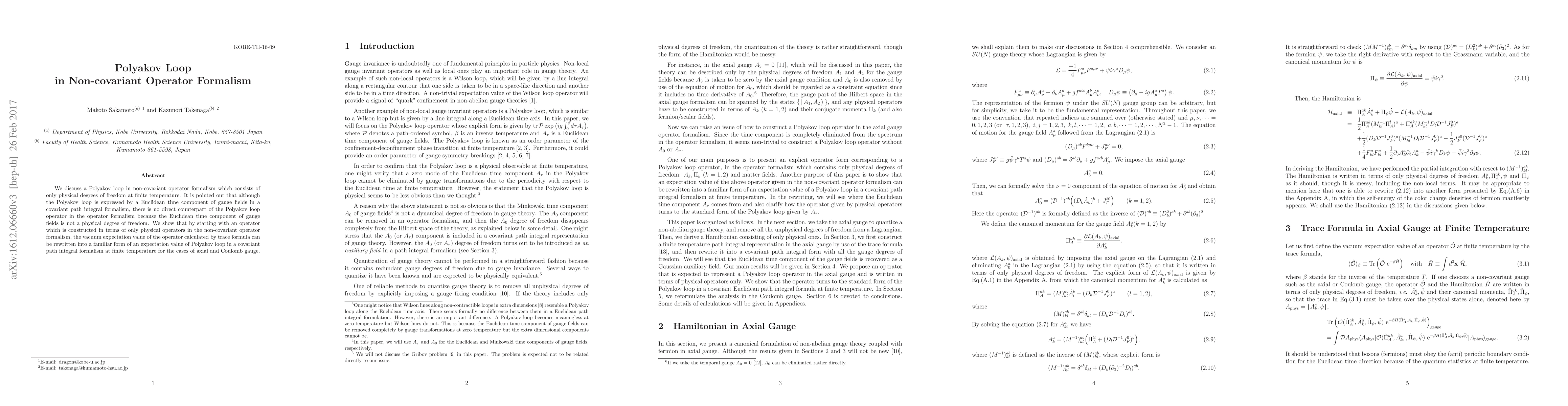 This paper explores the Polyakov loop in non-covariant operator formalism, demonstrating that it can be constructed using only physical degrees of freedom at finite temperature. It shows that while the Polyakov loop is represented by the Euclidean time component of gauge fields in covariant path integral formalism, no direct counterpart exists in the non-covariant formalism due to the non-physical nature of this component, and it provides a method to rewrite the vacuum expectation value of the operator in a familiar form.