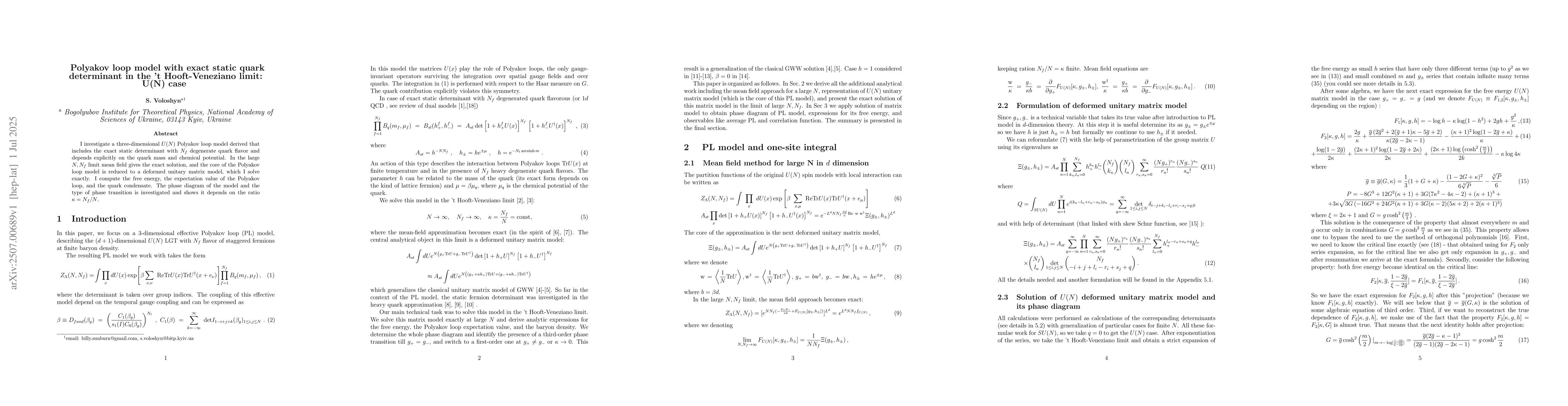 I investigate a three-dimensional $U(N)$ Polyakov loop model derived that includes the exact static determinant with $N_f$ degenerate quark flavor and depends explicitly on the quark mass and chemical potential. In the large $N, N_f$ limit mean field gives the exact solution, and the core of the Polyakov loop model is reduced to a deformed unitary matrix model, which I solve exactly. I compute the free energy, the expectation value of the Polyakov loop, and the quark condensate. The phase diagram of the model and the type of phase transition is investigated and shows it depends on the ratio $\kappa =N_f/N$.