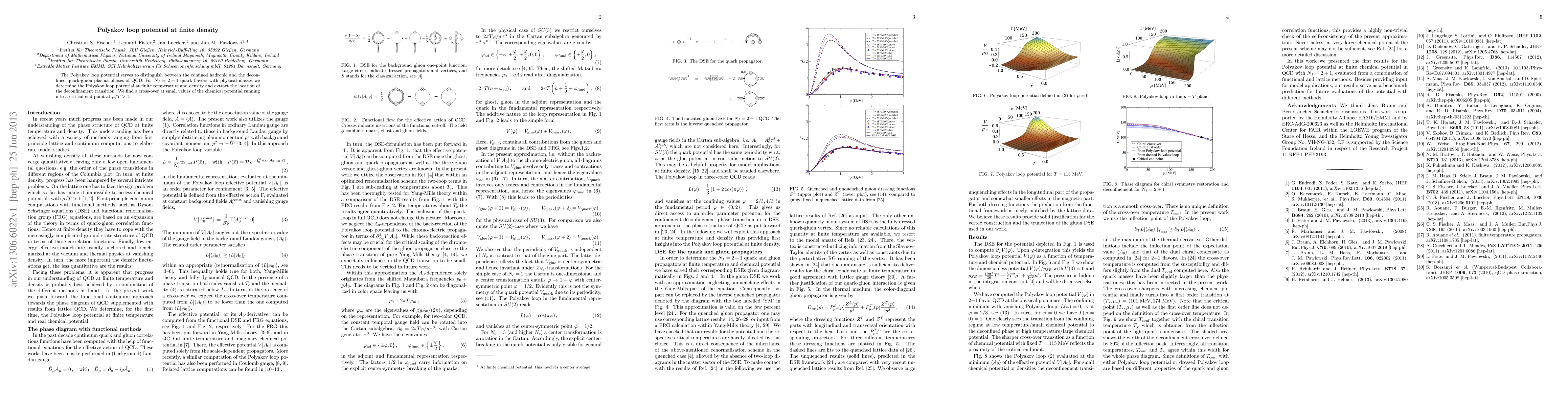 This study determines the Polyakov loop potential in QCD with two plus one flavors of quarks at finite temperature and density, revealing a crossover transition into a deconfined quark-gluon plasma phase, which culminates in a critical endpoint at mu/T > 1.