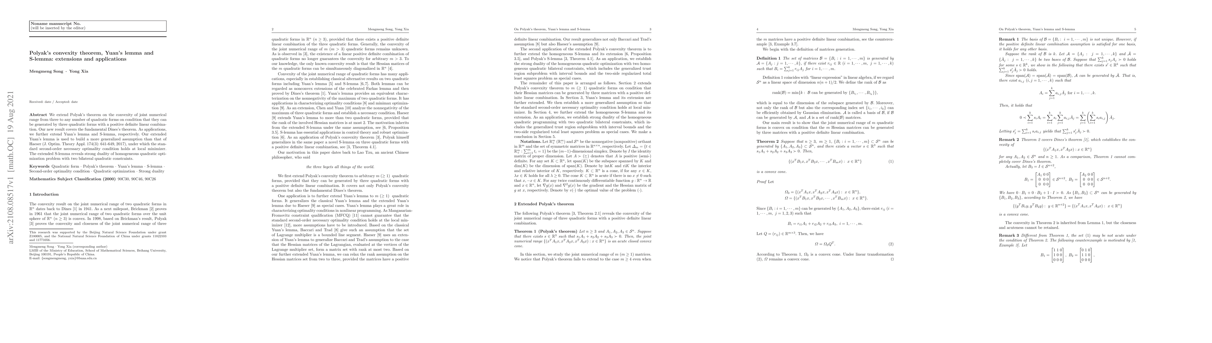 The paper extends Polyak's theorem to any number of quadratic forms, covers Dines's theorem, and applies Yuan's lemma and S-lemma with new conditions for strong duality in homogeneous quadratic optimization.