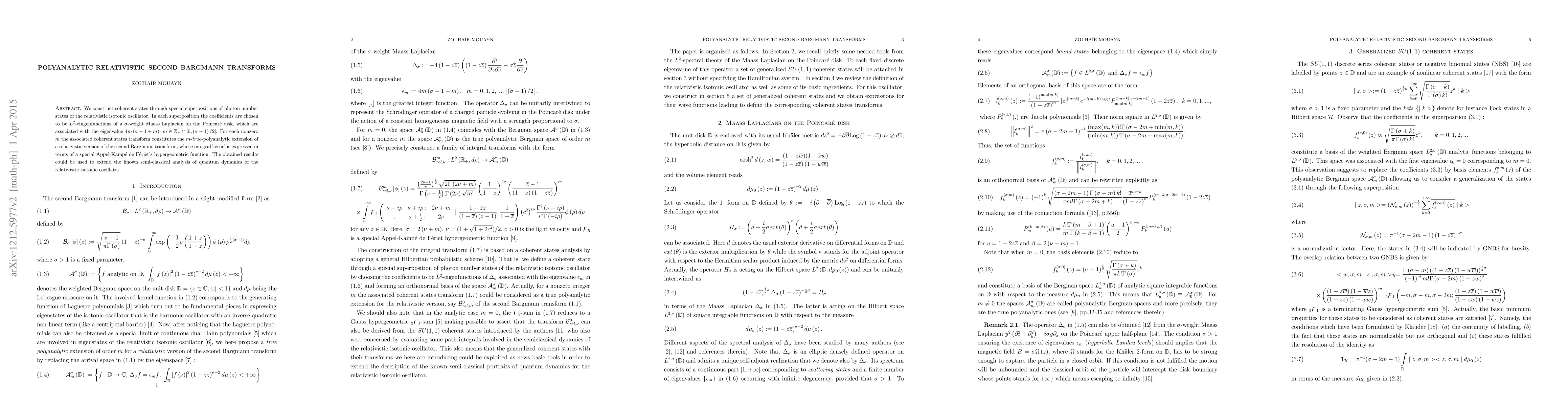 We construct coherent states through special superpositions of photon number states of the relativistic isotonic oscillator. In each superposition the coefficients are chosen to be L 2 eingenfunctions of a sigma weight Maass Laplacian on the Poincare disk, which are associated with discrete eigenvalues. For each nonzero m the associated coherent states transform constitutes the m true polyanalytic extension of a relativistic version of the second Bargmann transform, whose integral kernel is expressed in terms of a special Appel Kampe de Feriet hypergeometric function. The obtained results could be used to extend the known semi classical analysis of quantum dynamics of the relativistic isotonic oscillator.