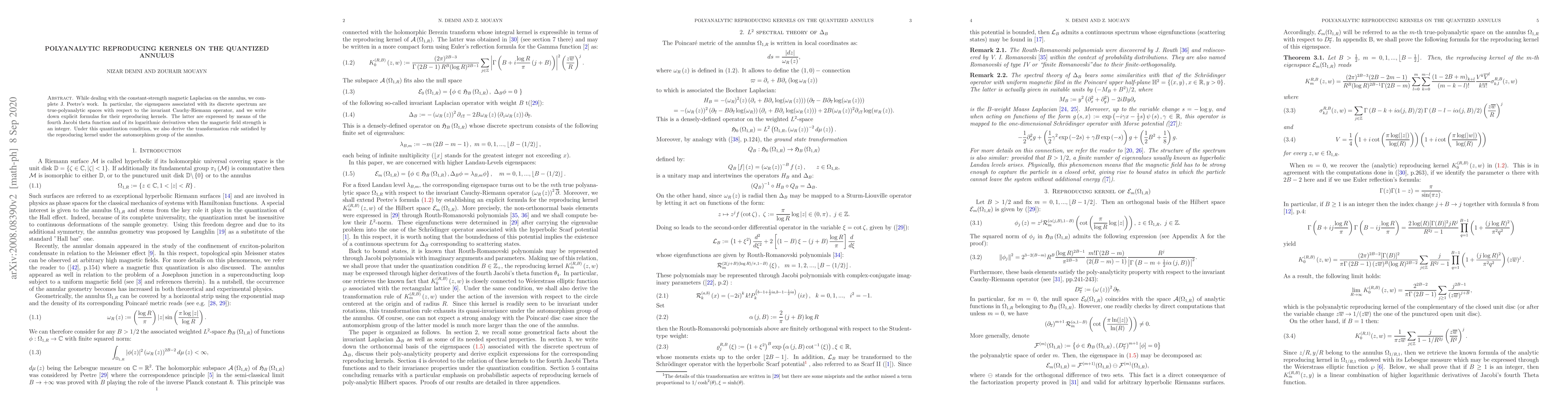 While dealing with the constant-strength magnetic Laplacian on the annulus, we complete J. Peetre's work. In particular, the eigenspaces associated with its discrete spectrum are true-polyanalytic spaces with respect to the invariant Cauchy-Riemann operator, and we write down explicit formulas for their reproducing kernels. The latter are expressed by means of the fourth Jacobi theta function and of its logarithmic derivatives when the magnetic field strength is an integer. Under this quantization condition, we also derive the transformation rule satisfied by the reproducing kernel under the automorphism group of the annulus.