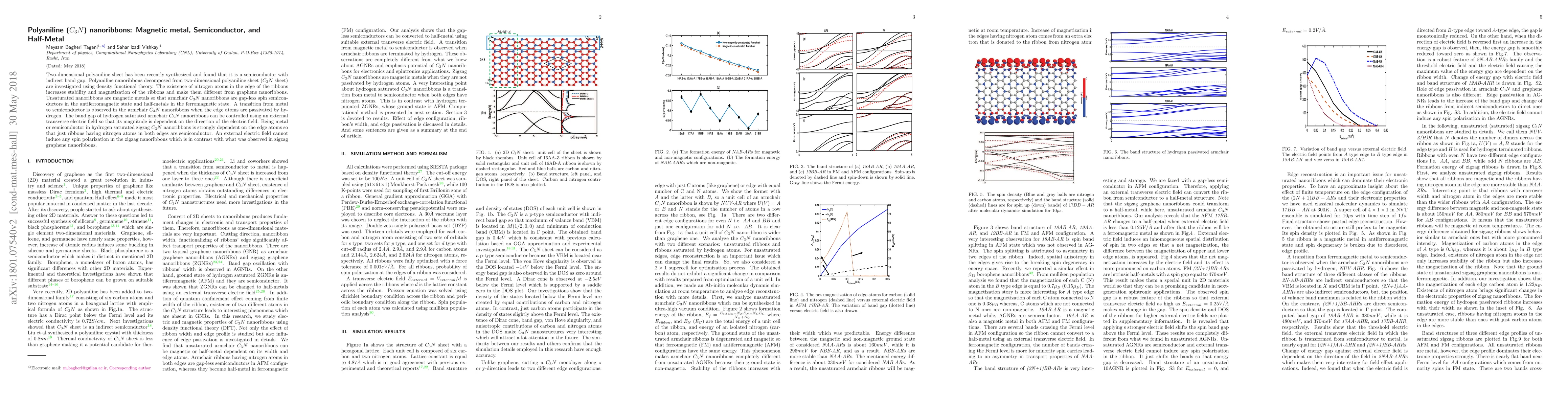 Summary: Polyaniline (C3N) nanoribbons exhibit diverse electronic properties, functioning as magnetic metals, semiconductors, and half-metals depending on their edge composition and external conditions. Hydrogen passivation transforms armchair nanoribbons into controllable semiconductors, while zigzag nanoribbons with nitrogen edges remain semiconductors, unaffected by external electric fields.