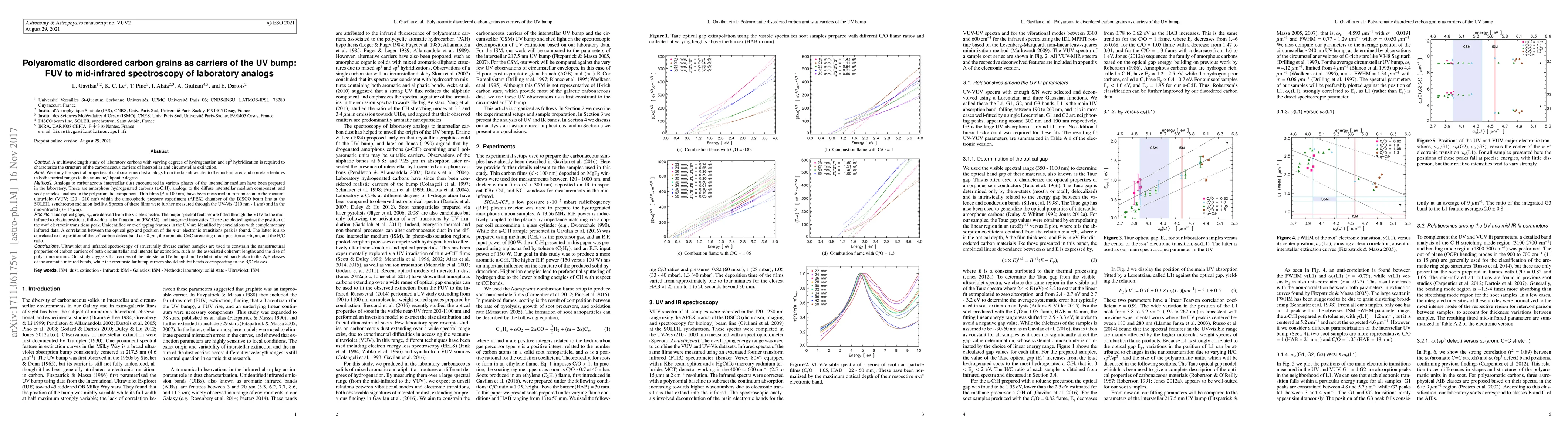 This study investigates laboratory analogs of interstellar carbon grains using multiwavelength spectroscopy from VUV to mid-infrared to characterize their structure and identify the carriers of the UV bump. Findings suggest that interstellar UV bump carriers exhibit A/B class infrared bands, while circumstellar bump carriers show B/C class infrared bands.