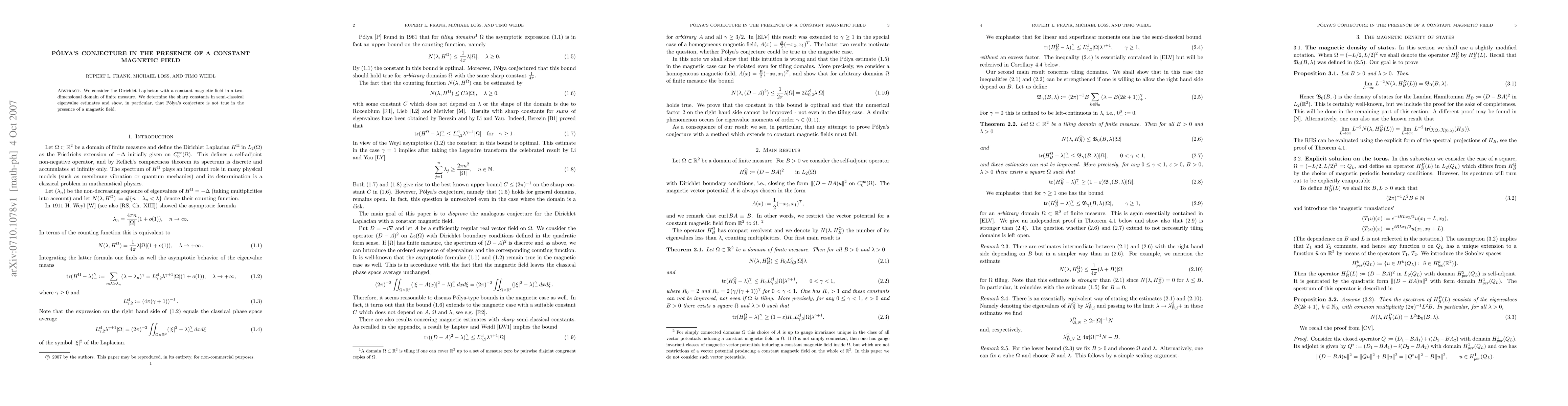 We consider the Dirichlet Laplacian with a constant magnetic field in a two-dimensional domain of finite measure. We determine the sharp constants in semi-classical eigenvalue estimates and show, in particular, that Polya's conjecture is not true in the presence of a magnetic field.