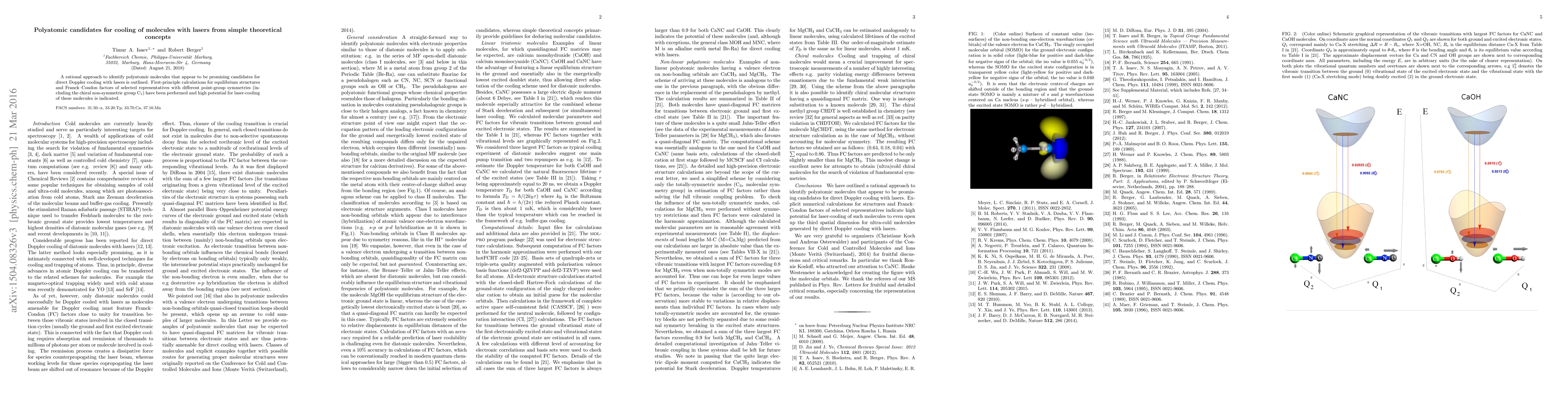 A rational approach to identify polyatomic molecules that appear to be promising candidates for direct Doppler cooling with lasers is outlined. First-principle calculations for equilibrium structures and Franck--Condon factors of selected representatives with different point-group symmetries (including chiral non-symmetric group C$_1$) have been performed and high potential for laser-cooling of these molecules is indicated.