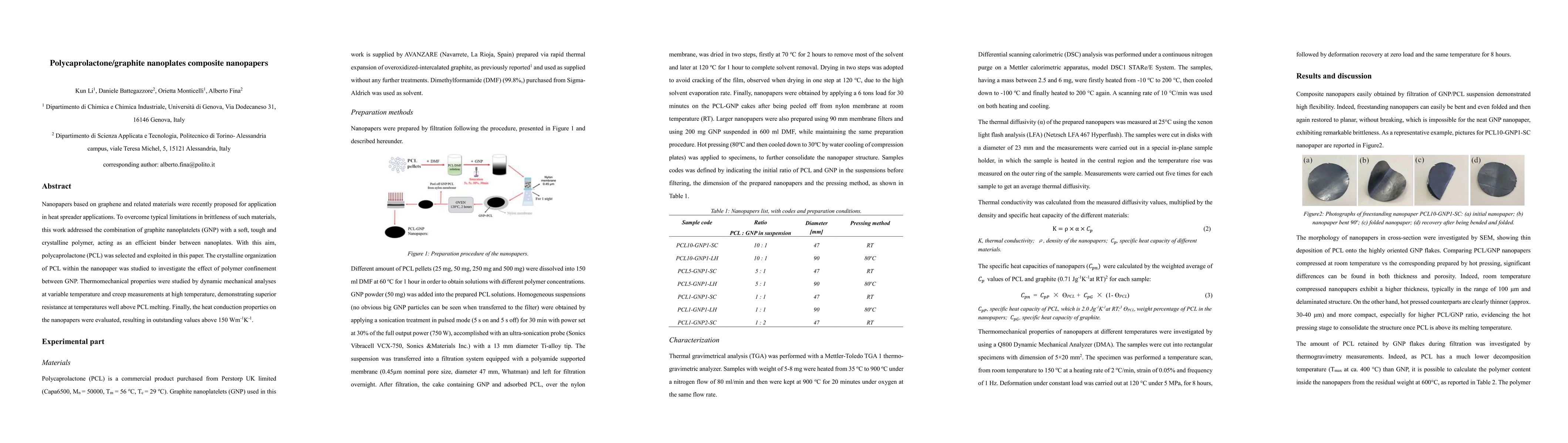 Nanopapers based on graphene and related materials were recently proposed for application in heat spreader applications. To overcome typical limitations in brittleness of such materials, this work addressed the combination of graphite nanoplatelets (GNP) with a soft, tough and crystalline polymer, acting as an efficient binder between nanoplates. With this aim, polycaprolactone (PCL) was selected and exploited in this paper. The crystalline organization of PCL within the nanopaper was studied to investigate the effect of polymer confinement between GNP. Thermomechanical properties were studied by dynamic mechanical analyses at variable temperature and creep measurements at high temperature, demonstrating superior resistance at temperatures well above PCL melting. Finally, the heat conduction properties on the nanopapers were evaluated, resulting in outstanding values above 150 Wm-1K-1.