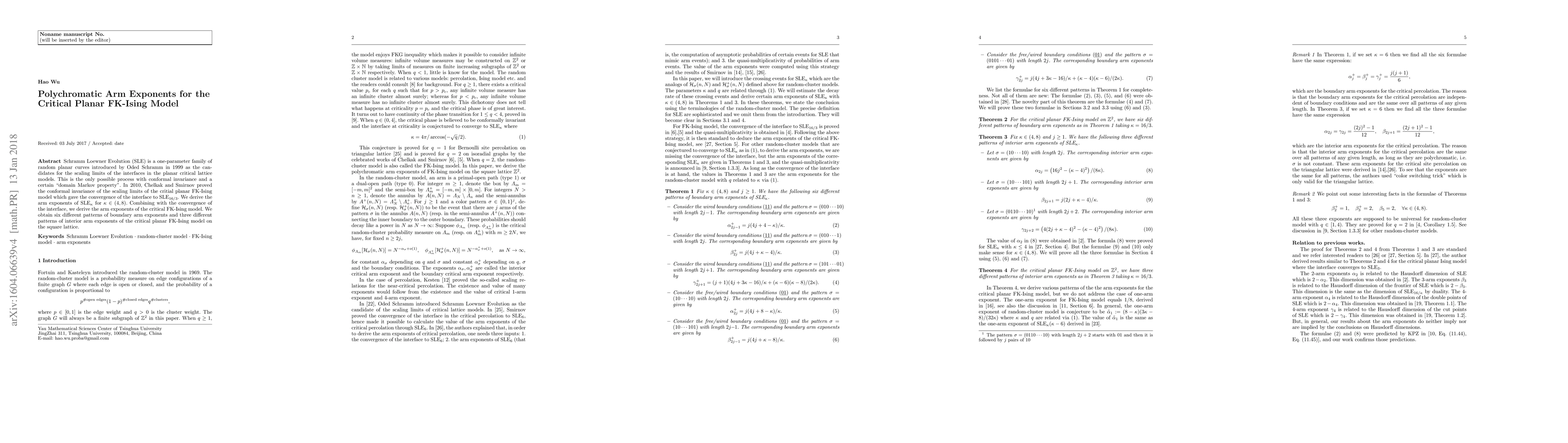 Schramm Loewner Evolution (SLE) is a one-parameter family of random planar curves introduced by Oded Schramm in 1999 as the candidates for the scaling limits of the interfaces in the planar critical lattice models. This is the only possible process with conformal invariance and a certain "domain Markov property". In 2010, Chelkak and Smirnov proved the conformal invariance of the scaling limits of the critial planar FK-Ising model which gave the convergence of the interface to SLE$_{16/3}$. We derive the arm exponents of SLE$_{\kappa}$ for $\kappa\in (4,8)$. Combining with the convergence of the interface, we derive the arm exponents of the critical FK-Ising model. We obtain six different patterns of boundary arm exponents and three different patterns of interior arm exponents of the critical planar FK-Ising model on the square lattice.