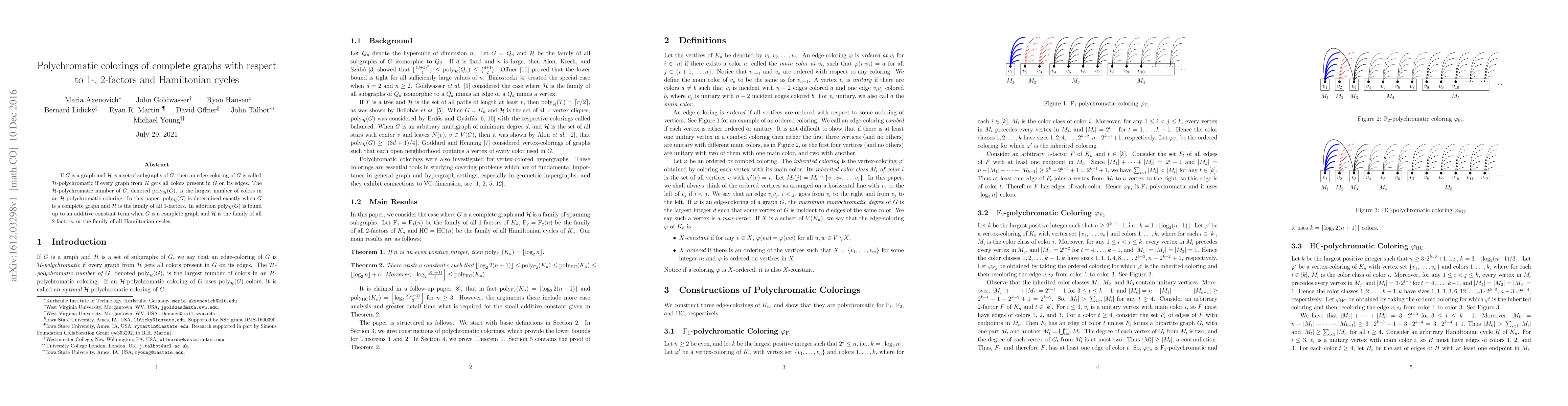 If G is a graph and H is a set of subgraphs of G, then an edge-coloring of G is called H-polychromatic if every graph from H gets all colors present in G on its edges. The H-polychromatic number of G, denoted poly_H(G), is the largest number of colors in an H-polychromatic coloring. In this paper, poly_H(G) is determined exactly when G is a complete graph and H is the family of all 1-factors. In addition poly_H(G) is found up to an additive constant term when G is a complete graph and H is the family of all 2-factors, or the family of all Hamiltonian cycles.