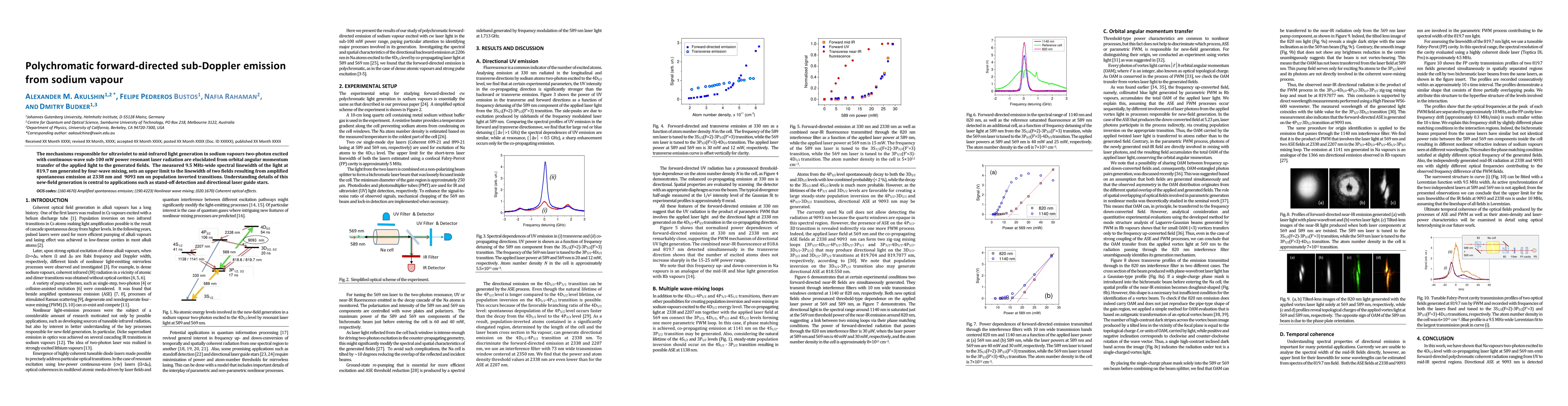 The mechanisms responsible for ultraviolet to mid-infrared light generation in sodium vapours two-photon excited with continuous-wave sub-100 mW power resonant laser radiation are elucidated from orbital angular momentum transfer of the applied light to the generated fields. The measured 9.5 MHz-wide spectral linewidth of the light at 819.7 nm generated by four-wave mixing, sets an upper limit to the linewidth of two fields resulting from amplified spontaneous emission at 2338 nm and 9093 nm on population inverted transitions. Understanding details of this new-field generation is central to applications such as stand-off detection and directional laser guide stars.