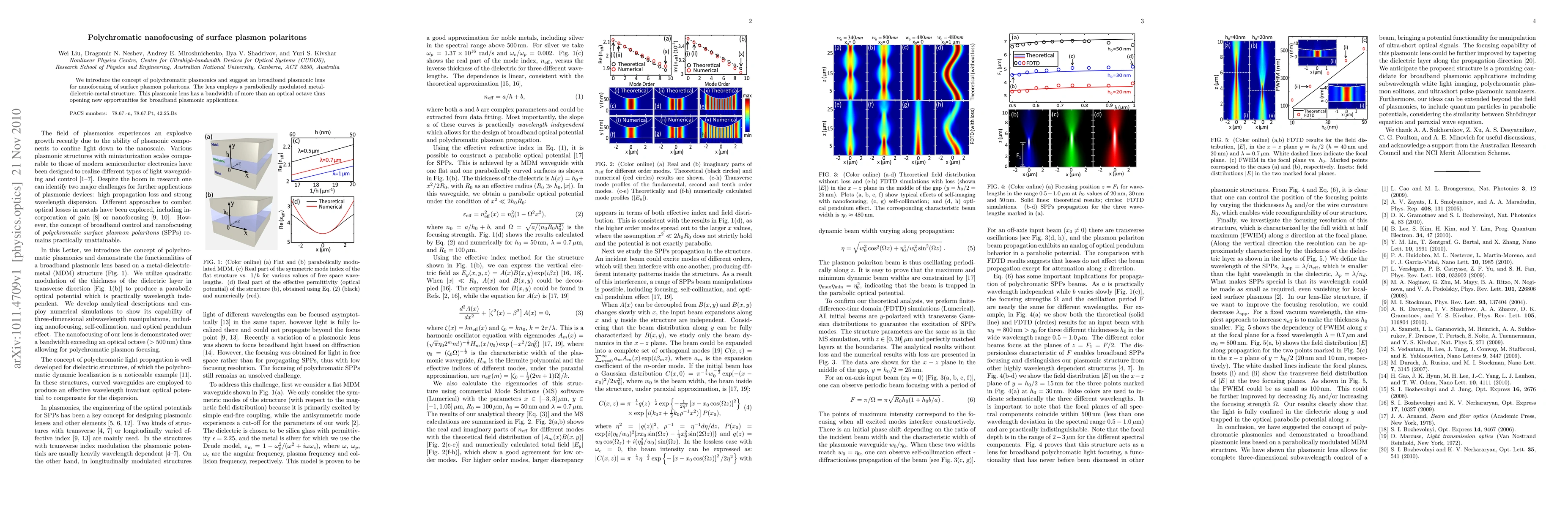 This paper introduces polychromatic plasmonics and proposes a broadband plasmonic lens using a parabolically modulated metal-dielectric-metal structure for nanofocusing surface plasmon polaritons, with a bandwidth exceeding an optical octave, enabling new opportunities in broadband applications.