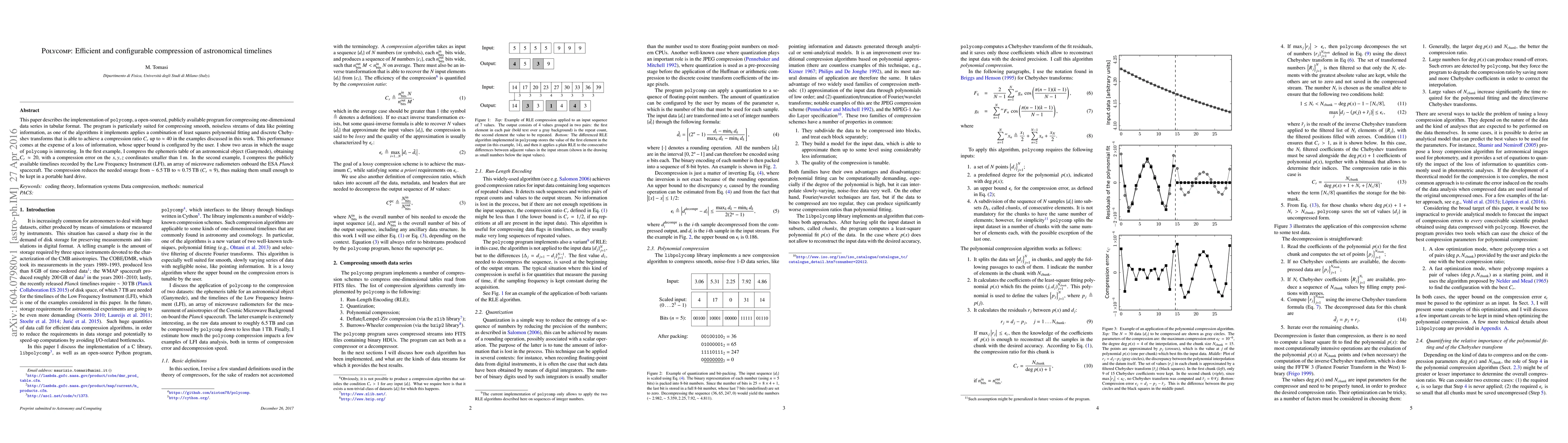 This paper describes the implementation of polycomp, a open-sourced, publicly available program for compressing one-dimensional data series in tabular format. The program is particularly suited for compressing smooth, noiseless streams of data like pointing information, as one of the algorithms it implements applies a combination of least squares polynomial fitting and discrete Chebyshev transforms that is able to achieve a compression ratio Cr up to ~40 in the examples discussed in this work. This performance comes at the expense of a loss of information, whose upper bound is configured by the user. I show two areas in which the usage of polycomp is interesting. In the first example, I compress the ephemeris table of an astronomical object (Ganymede), obtaining Cr ~ 20, with a compression error on the x, y, z coordinates smaller than 1 m. In the second example, I compress the publicly available timelines recorded by the Low Frequency Instrument (LFI), an array of microwave radiometers onboard the ESA Planck spacecraft. The compression reduces the needed storage from ~6.5 TB to ~0.75 TB (C_r ~ 9), thus making them small enough to be kept in a portable hard drive.