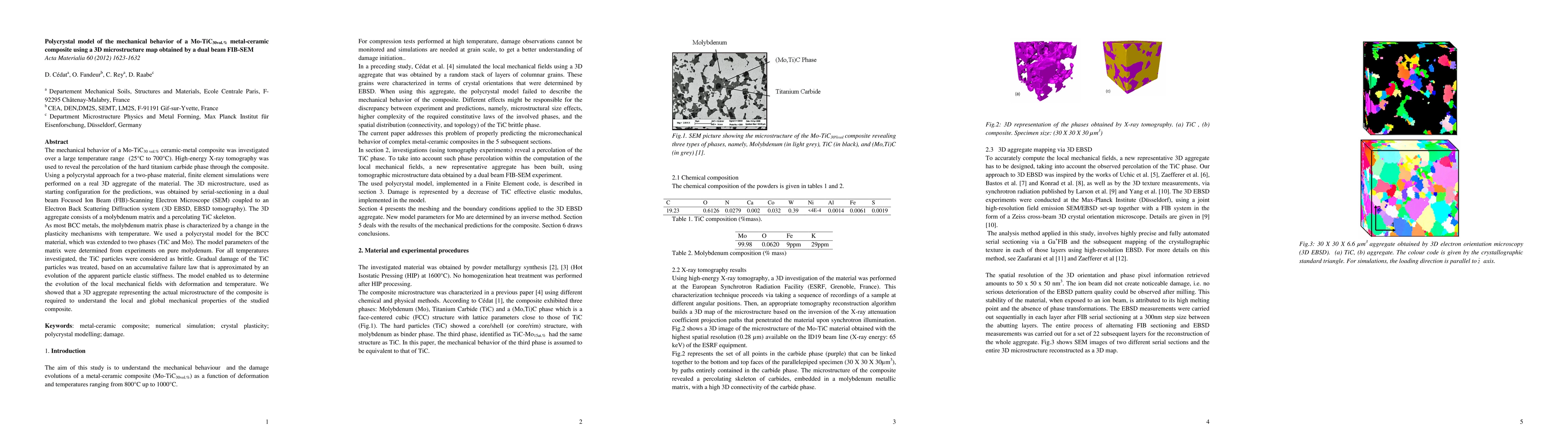 The mechanical behavior of a Mo-TiC30 vol.% ceramic-metal composite was investigated over a large temperature range (25^{\circ}C to 700^{\circ}C). High-energy X-ray tomography was used to reveal the percolation of the hard titanium carbide phase through the composite. Using a polycrystal approach for a two-phase material, finite element simulations were performed on a real 3D aggregate of the material. The 3D microstructure, used as starting configuration for the predictions, was obtained by serial-sectioning in a dual beam Focused Ion Beam (FIB)-Scanning Electron Microscope (SEM) coupled to an Electron Back Scattering Diffraction system (3D EBSD, EBSD tomography). The 3D aggregate consists of a molybdenum matrix and a percolating TiC skeleton. As most BCC metals, the molybdenum matrix phase is characterized by a change in the plasticity mechanisms with temperature. We used a polycrystal model for the BCC material, which was extended to two phases (TiC and Mo). The model parameters of the matrix were determined from experiments on pure molydenum. For all temperatures investigated, the TiC particles were considered as brittle. Gradual damage of the TiC particles was treated, based on an accumulative failure law that is approximated by an evolution of the apparent particle elastic stiffness. The model enabled us to determine the evolution of the local mechanical fields with deformation and temperature. We showed that a 3D aggregate representing the actual microstructure of the composite is required to understand the local and global mechanical properties of the studied composite.