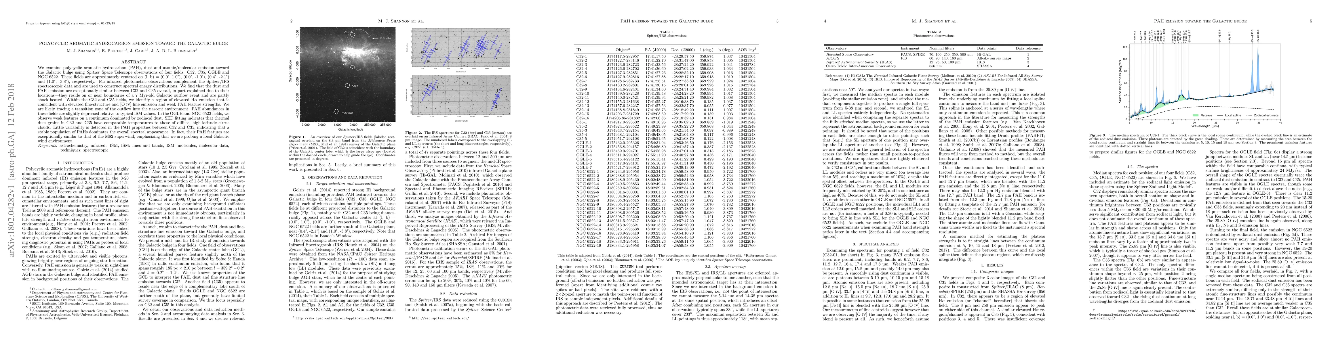 This study uses Spitzer Space Telescope observations to analyze polycyclic aromatic hydrocarbon (PAH), dust, and atomic/molecular emissions toward the Galactic bulge, finding that PAH abundances are slightly depressed and dust emissions are similar in two fields, suggesting a stable PAH population and a local Galactic wind environment.