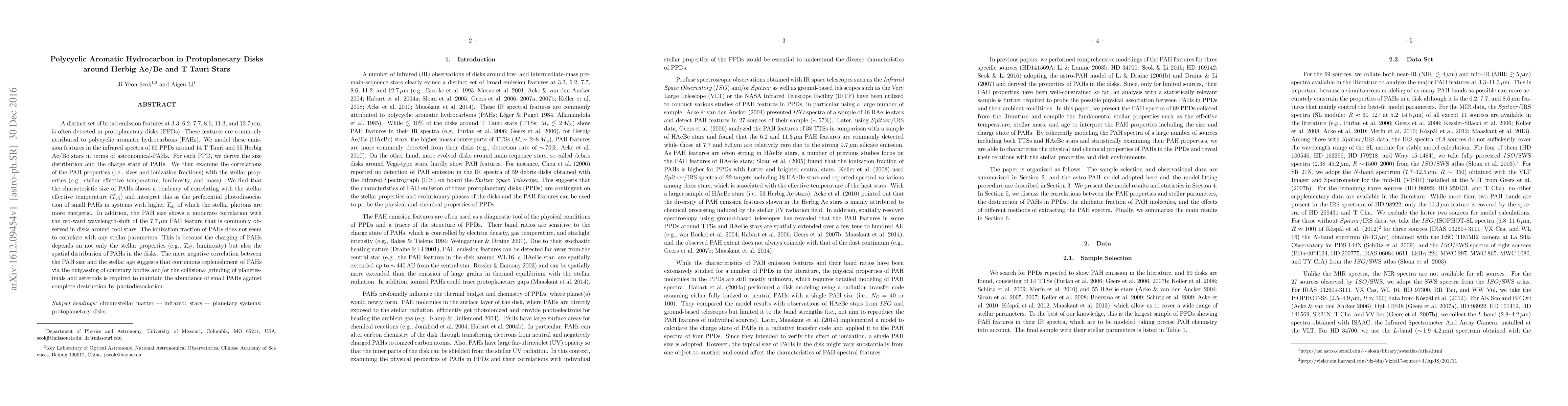 This study models polycyclic aromatic hydrocarbons (PAH) emission features in protoplanetary disks around Herbig Ae/Be and T Tauri stars, finding that PAH size correlates with stellar effective temperature due to preferential photodissociation of smaller PAHs in hotter systems. The ionization fraction of PAHs does not correlate with stellar parameters, suggesting that it depends on both stellar properties and PAH spatial distribution.