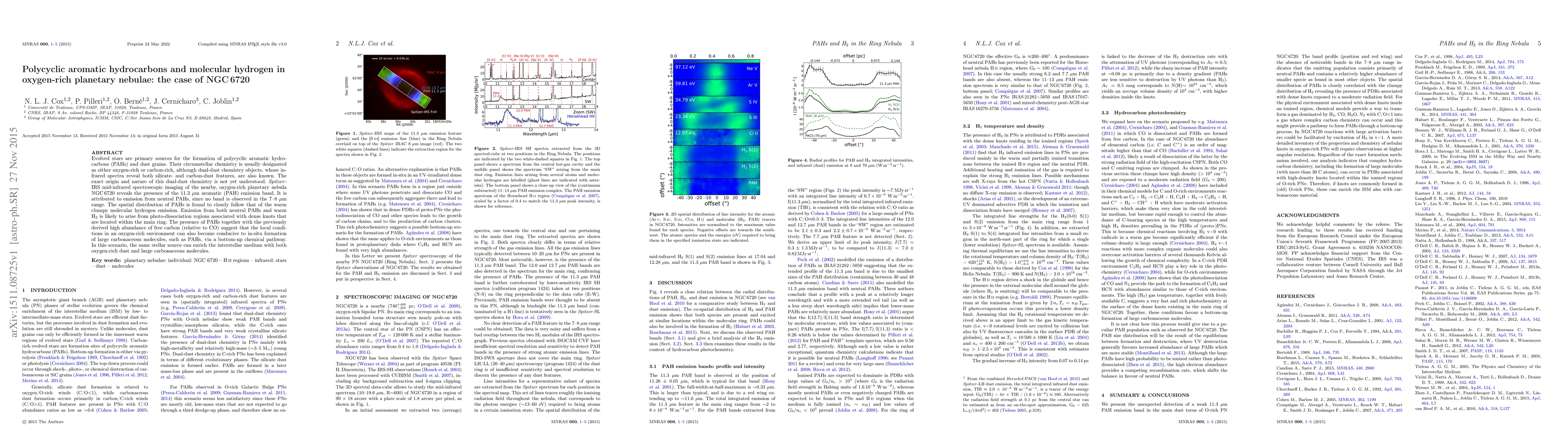 Evolved stars are primary sources for the formation of polycyclic aromatic hydrocarbons (PAHs) and dust grains. Their circumstellar chemistry is usually designated as either oxygen-rich or carbon-rich, although dual-dust chemistry objects, whose infrared spectra reveal both silicate- and carbon-dust features, are also known. The exact origin and nature of this dual-dust chemistry is not yet understood. Spitzer-IRS mid-infrared spectroscopic imaging of the nearby, oxygen-rich planetary nebula NGC6720 reveals the presence of the 11.3 micron aromatic (PAH) emission band. It is attributed to emission from neutral PAHs, since no band is observed in the 7 to 8 micron range. The spatial distribution of PAHs is found to closely follow that of the warm clumpy molecular hydrogen emission. Emission from both neutral PAHs and warm H2 is likely to arise from photo-dissociation regions associated with dense knots that are located within the main ring. The presence of PAHs together with the previously derived high abundance of free carbon (relative to CO) suggest that the local conditions in an oxygen-rich environment can also become conducive to in-situ formation of large carbonaceous molecules, such as PAHs, via a bottom-up chemical pathway. In this scenario, the same stellar source can enrich the interstellar medium with both oxygen-rich dust and large carbonaceous molecules.