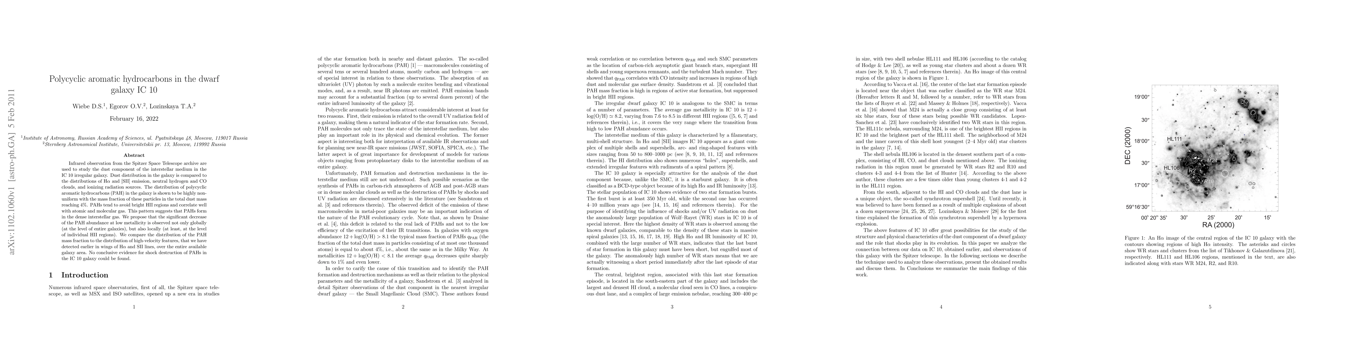 Infrared observations from the Spitzer Space Telescope archive are used to study the dust component of the interstellar medium in the IC~10 irregular galaxy. Dust distribution in the galaxy is compared to the distributions of H$\alpha$ and [SII] emission, neutral hydrogen and CO clouds, and ionizing radiation sources. The distribution of polycyclic aromatic hydrocarbons (PAH) in the galaxy is shown to be highly non-uniform with the mass fraction of these particles in the total dust mass reaching 4%. PAHs tend to avoid bright HII regions and correlate well with atomic and molecular gas. This pattern suggests that PAHs form in the dense interstellar gas. We propose that the significant decrease of the PAH abundance at low metallicity is observed not only globally (at the level of entire galaxies), but also locally (at least, at the level of individual HII regions). We compare the distribution of the PAH mass fraction to the distribution of high-velocity features, that we have detected earlier in wings of H$\alpha$ and SII lines, over the entire available galaxy area. No conclusive evidence for shock destruction of PAHs in the IC~10 galaxy could be found.
