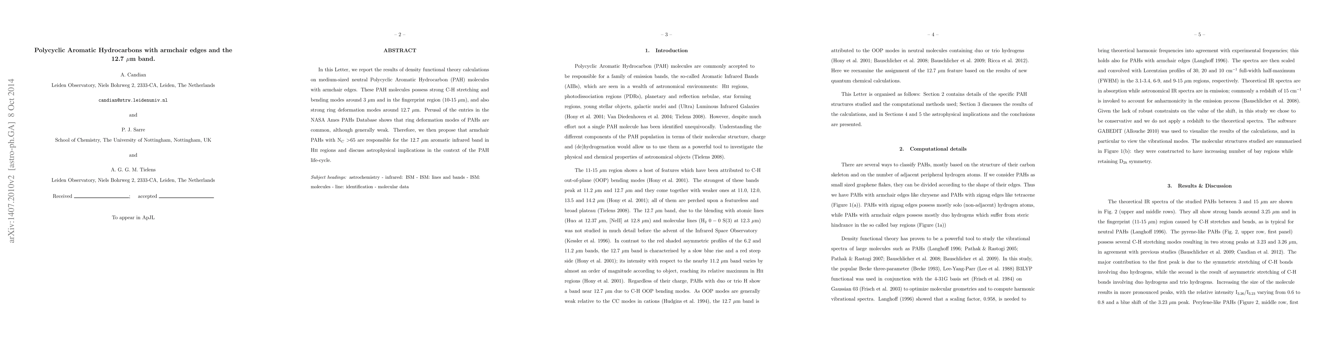 In this Letter we report the results of density functional theory calculations on medium-sized neutral Polycyclic Aromatic Hydrocarbon (PAH) molecules with armchair edges. These PAH molecules possess strong C-H stretching and bending modes around 3 {\mu}m and in the fingerprint region (10-15 {\mu}m), and also strong ring deformation modes around 12.7 {\mu}m. Perusal of the entries in the NASA Ames PAHs Database shows that ring deformation modes of PAHs are common - although generally weak. We then propose that armchair PAHs with NC >65 are responsible for the 12.7 {\mu}m Aromatic Infrared Band in HII regions and discuss astrophysical implications in the context of the PAH life-cycle.