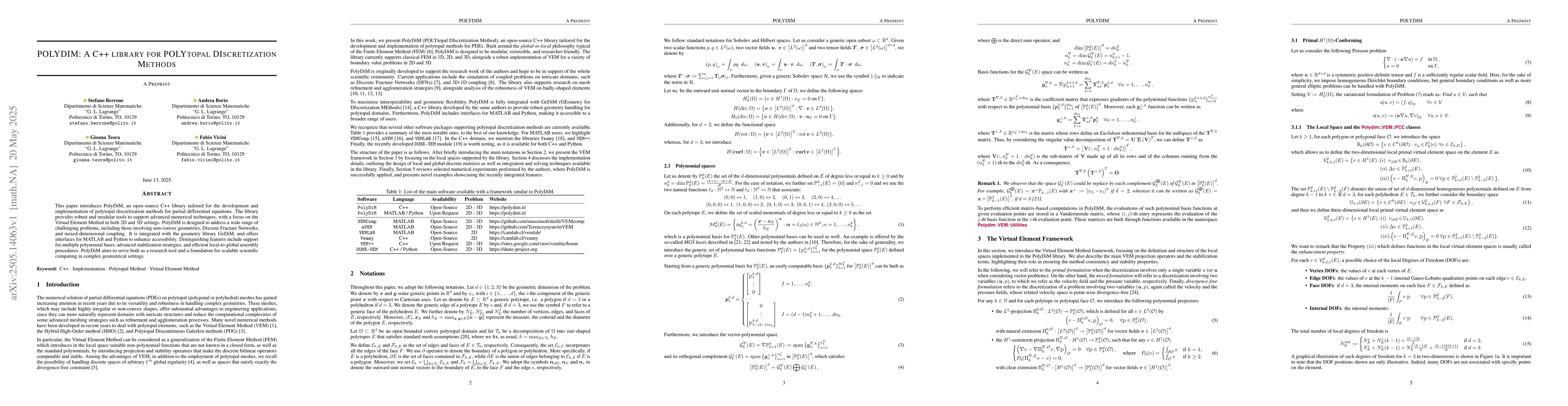 The paper describes the development of PolyDiM, a C++ library for polytopal discretization methods, focusing on the Virtual Element Method for 2D and 3D problems, including complex geometries and mixed-dimensional coupling.