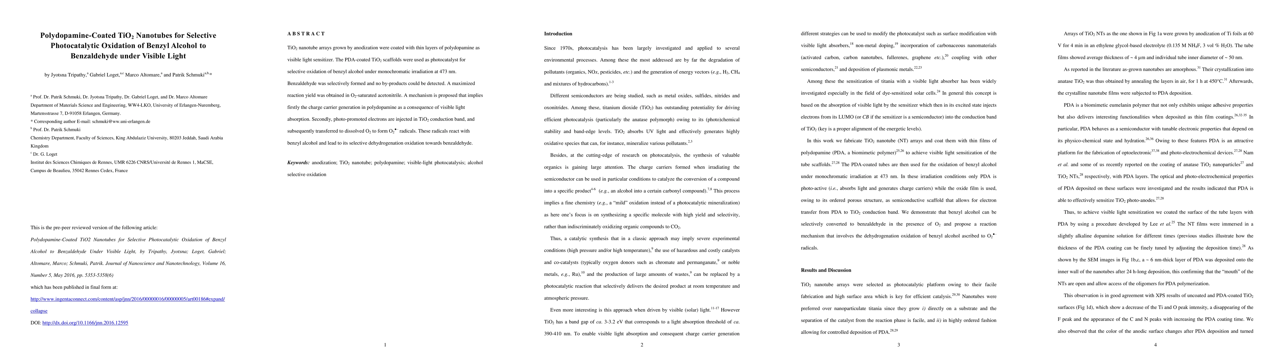 This paper investigates polydopamine-coated TiO2 nanotubes for selective photocatalytic oxidation of benzyl alcohol to benzaldehyde under visible light. The study finds that the PDA-coated TiO2 scaffolds efficiently convert benzyl alcohol to benzaldehyde without by-products, achieving a maximized yield in O2-saturated acetonitrile, through a mechanism involving visible light-induced charge carrier generation and subsequent radical formation.