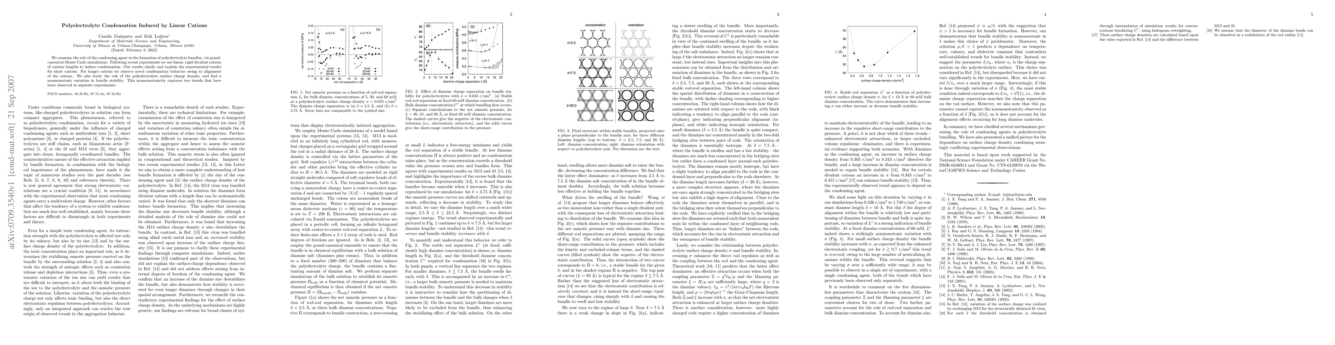 This study investigates polyelectrolyte condensation using linear, rigid divalent cations via Monte Carlo simulations, revealing novel condensation behavior for longer cations due to alignment effects. The research also highlights a nonmonotonic relationship between surface charge density and bundle stability, explaining observed experimental trends.
