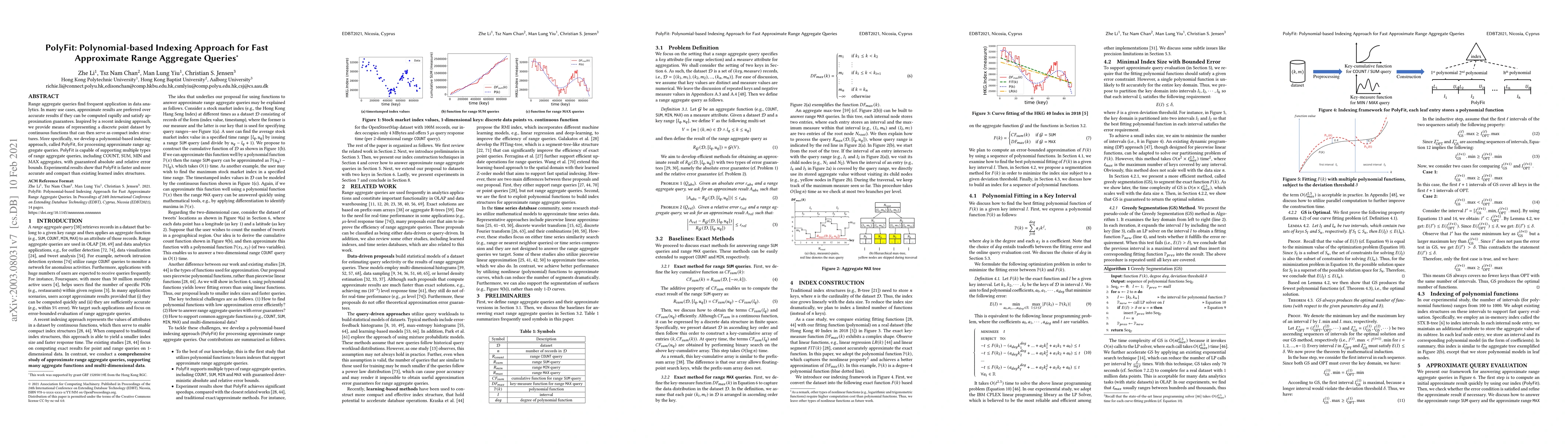 PolyFit is a polynomial-based indexing approach for fast approximate range aggregate queries, supporting COUNT, SUM, MIN, and MAX with error bounds. It outperforms existing learned index structures in speed, accuracy, and compactness.